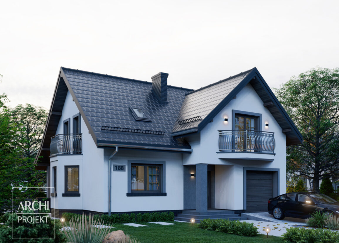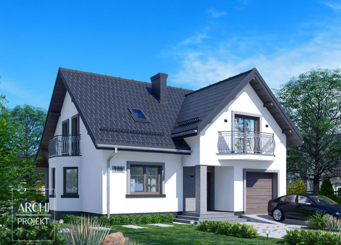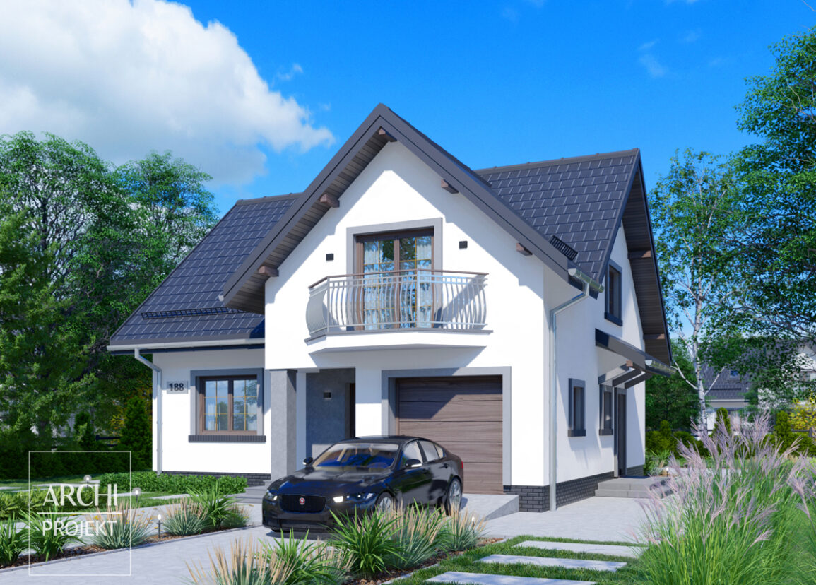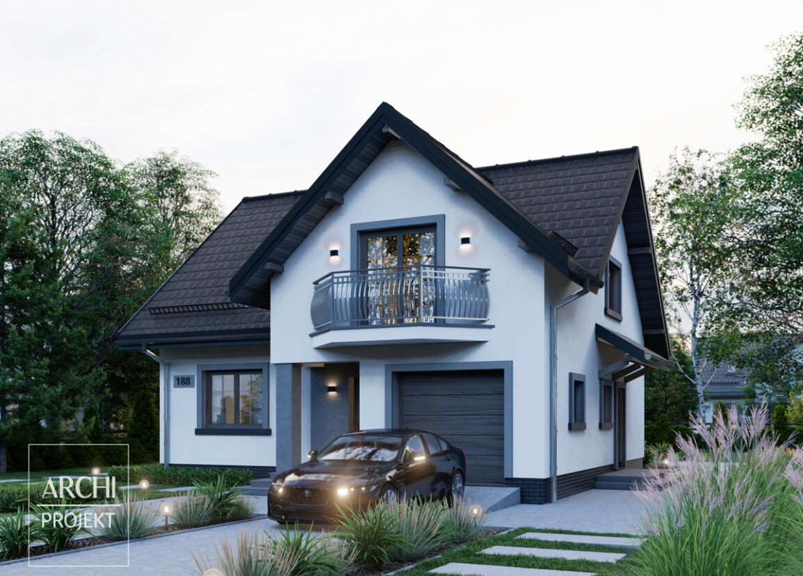 Zgrabny dom o ładnej, proporcjonalnej sylwetce i nowocześnie zaprojektowanym układzie pomieszczeń, przeznaczony dla 4 osobowej rodziny. Wejście do domu, osłonięte praktycznym w naszym klimacie podcieniem, prowadzi przez przedsionek do otwartej i przestronnej części dziennej. Usytuowana od frontu wygodna kuchnia sąsiaduje z jadalnią. Obszerny pokój dzienny, oprócz ciekawego wnętrza ma także połączenie z dużym tarasem. Taki osłoniętym dachem taras to duża zaleta domu, szczególnie w naszym klimacie. Na parterze znajdują się jeszcze: łazienka, schowek pod schodami, oraz garaż i kotłownia, która posiada dodatkowe wejście z zewnątrz w bocznej ścianie domu. Zlokalizowana na poddaszu część sypialna zawiera 3 optymalnie zaprojektowane sypialnie (sypialnia małżeńska z garderobami dla każdego z małżonków!) i wygodną łazienkę z wydzieloną pralnią-suszarnią. Wkrótce wersja projektu z piwnicą - APS 188+P - w piwnicy kotłownia i garaż, na parterze dodatkowy pokój i garderoba. Zobacz także projekt APS 188 w nowoczesnej stylizacji. Zobacz podobne projekty: APS 108, APS 191, APS 201, APS 214.
