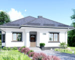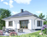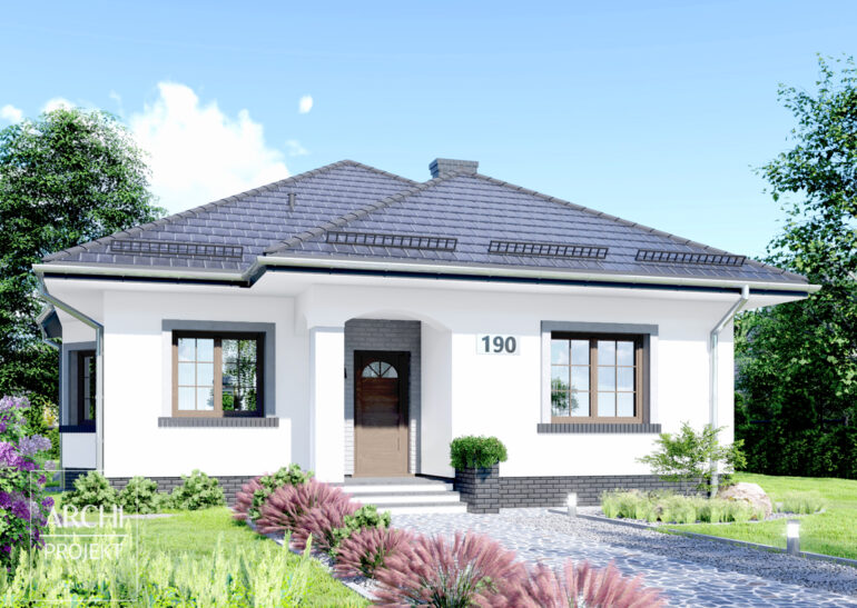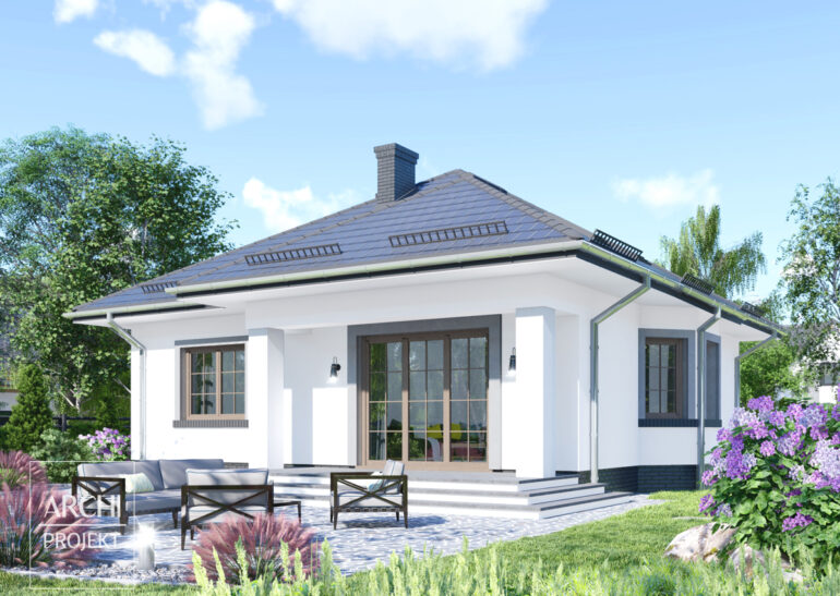 Niewielki parterowy dom o funkcjonalnym wnętrzu i ładnej, proporcjonalnej sylwetce, przeznaczony dla 3-4 osobowej rodziny szukającej niezbyt drogiego w realizacji, wygodnego domu. Wejście do domu, zaakcentowane łukowym podcieniem, prowadzi do przedsionka i dalej do hallu. Wygodna kuchnia z widokiem na stronę frontową sąsiaduje z salonem. Pokój dzienny zawiera jadalnię i część wypoczynkową z kominkiem. Zadaszony taras jest praktycznym przedłużeniem salonu. Część sypialna zawiera dwie foremne sypialnie i łazienkę. Zaletą tego domu jest możliwość wykorzystania w perspektywie strychu na dodatkowe pomieszczenia mieszkalne. Część gospodarcza z kotłownią w piwnicy pozwalają na ogrzewanie domu dowolnym systemem c.o., a zwarta bryła domu i dobra izolacja ograniczają straty ciepła. Istnieje także możliwość dobudowy garażu. Zobacz także projekty: APS 93, APS 189,APS 190 NEW.