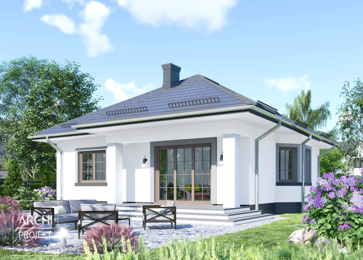 Niewielki parterowy dom o funkcjonalnym wnętrzu i ładnej, proporcjonalnej sylwetce, przeznaczony dla 3-4 osobowej rodziny szukającej niezbyt drogiego w realizacji, wygodnego domu. Wejście do domu, zaakcentowane łukowym podcieniem, prowadzi do przedsionka i dalej do hallu. Wygodna kuchnia z widokiem na stronę frontową sąsiaduje z salonem. Pokój dzienny zawiera jadalnię i część wypoczynkową z kominkiem. Zadaszony taras jest praktycznym przedłużeniem salonu. Część sypialna zawiera dwie foremne sypialnie i łazienkę. Zaletą tego domu jest możliwość wykorzystania w perspektywie strychu na dodatkowe pomieszczenia mieszkalne. Część gospodarcza z kotłownią w piwnicy pozwalają na ogrzewanie domu dowolnym systemem c.o., a zwarta bryła domu i dobra izolacja ograniczają straty ciepła. Istnieje także możliwość dobudowy garażu. Zobacz także projekty: APS 93, APS 189,APS 190 NEW.