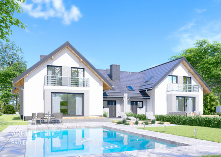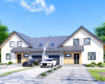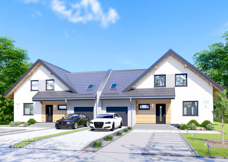 Wygodny dom bliźniaczy o eleganckim wyglądzie i funkcjonalnie zaprojektowanym wnętrzu. Każdy segment dla 4-6 osób. Wejście do domu i wjazd do garażu osłonięte są efektownym i praktycznym daszkiem. Wejście do domu prowadzi przez wiatrołap z miejscem na szafę ubraniową. Wewnątrz na parterze - zgrabna kuchnia połączona przestrzennie z jadalnią i pokojem dziennym. Niewątpliwą zaletą salonu, oprócz dużej powierzchni i kominka, jest szeroki wykusz, dobrze oświetlający pokój, z drzwiami prowadzącymi na obszerny taras. Na parterze, na poziomie zbliżonym do poziomu terenu znajduje się jaszcze garaż i kotłownia. Efektowne schody prowadzą na poddasze, gdzie znajdują się dwa pokoje dziecinne z balkonem wychodzącym na ogród, sypialnia małżeńska z garderobą, oraz przestronna łazienka. Strych na półpiętrze możliwy jest do wykorzystania na dodatkowy pokój lub pomieszczenie rekreacyjne. Podane powierzchnie dotyczą jednego segmentu. POWYŻSZA CENA DOTYCZY JEDNEGO SEGMENTU.