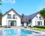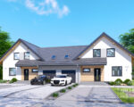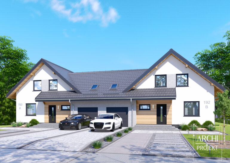 Wygodny dom dwulokalowy (składający się z dwóch bliźniaczych segmentów) o eleganckim wyglądzie i funkcjonalnie zaprojektowanym wnętrzu. Każdy segment dla 4-6 osób. Wejście do domu i wjazd do garażu osłonięte są efektownym i praktycznym daszkiem. Wejście do domu prowadzi przez wiatrołap z miejscem na szafę ubraniową. Wewnątrz na parterze - zgrabna kuchnia połączona przestrzennie z jadalnią i pokojem dziennym. Niewątpliwą zaletą salonu, oprócz dużej powierzchni i kominka, jest szeroki wykusz, dobrze oświetlający pokój, z drzwiami prowadzącymi na obszerny taras. Na parterze, na poziomie zbliżonym do poziomu terenu znajduje się jaszcze garaż i kotłownia. Efektowne schody prowadzą na poddasze, gdzie znajdują się dwa pokoje dziecinne z balkonem wychodzącym na ogród, sypialnia małżeńska z garderobą, oraz przestronna łazienka. Strych na półpiętrze możliwy jest do wykorzystania na dodatkowy pokój lub pomieszczenie rekreacyjne.