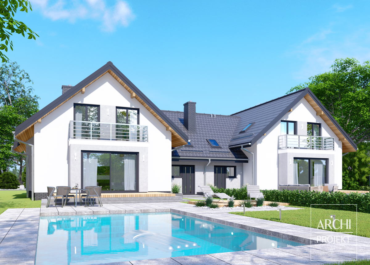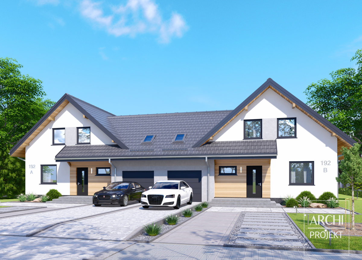 Wygodny dom dwulokalowy (składający się z dwóch bliźniaczych segmentów) o eleganckim wyglądzie i funkcjonalnie zaprojektowanym wnętrzu. Każdy segment dla 4-6 osób. Wejście do domu i wjazd do garażu osłonięte są efektownym i praktycznym daszkiem. Wejście do domu prowadzi przez wiatrołap z miejscem na szafę ubraniową. Wewnątrz na parterze - zgrabna kuchnia połączona przestrzennie z jadalnią i pokojem dziennym. Niewątpliwą zaletą salonu, oprócz dużej powierzchni i kominka, jest szeroki wykusz, dobrze oświetlający pokój, z drzwiami prowadzącymi na obszerny taras. Na parterze, na poziomie zbliżonym do poziomu terenu znajduje się jaszcze garaż i kotłownia. Efektowne schody prowadzą na poddasze, gdzie znajdują się dwa pokoje dziecinne z balkonem wychodzącym na ogród, sypialnia małżeńska z garderobą, oraz przestronna łazienka. Strych na półpiętrze możliwy jest do wykorzystania na dodatkowy pokój lub pomieszczenie rekreacyjne.