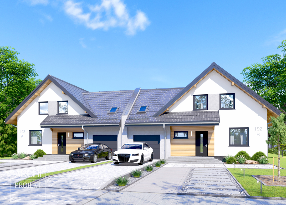 Wygodny dom bliźniaczy o eleganckim wyglądzie i funkcjonalnie zaprojektowanym wnętrzu. Każdy segment dla 4-6 osób. Wejście do domu i wjazd do garażu osłonięte są efektownym i praktycznym daszkiem. Wejście do domu prowadzi przez wiatrołap z miejscem na szafę ubraniową. Wewnątrz na parterze - zgrabna kuchnia połączona przestrzennie z jadalnią i pokojem dziennym. Niewątpliwą zaletą salonu, oprócz dużej powierzchni i kominka, jest szeroki wykusz, dobrze oświetlający pokój, z drzwiami prowadzącymi na obszerny taras. Na parterze, na poziomie zbliżonym do poziomu terenu znajduje się jaszcze garaż i kotłownia. Efektowne schody prowadzą na poddasze, gdzie znajdują się dwa pokoje dziecinne z balkonem wychodzącym na ogród, sypialnia małżeńska z garderobą, oraz przestronna łazienka. Strych na półpiętrze możliwy jest do wykorzystania na dodatkowy pokój lub pomieszczenie rekreacyjne. Podane powierzchnie dotyczą jednego segmentu. POWYŻSZA CENA DOTYCZY JEDNEGO SEGMENTU.