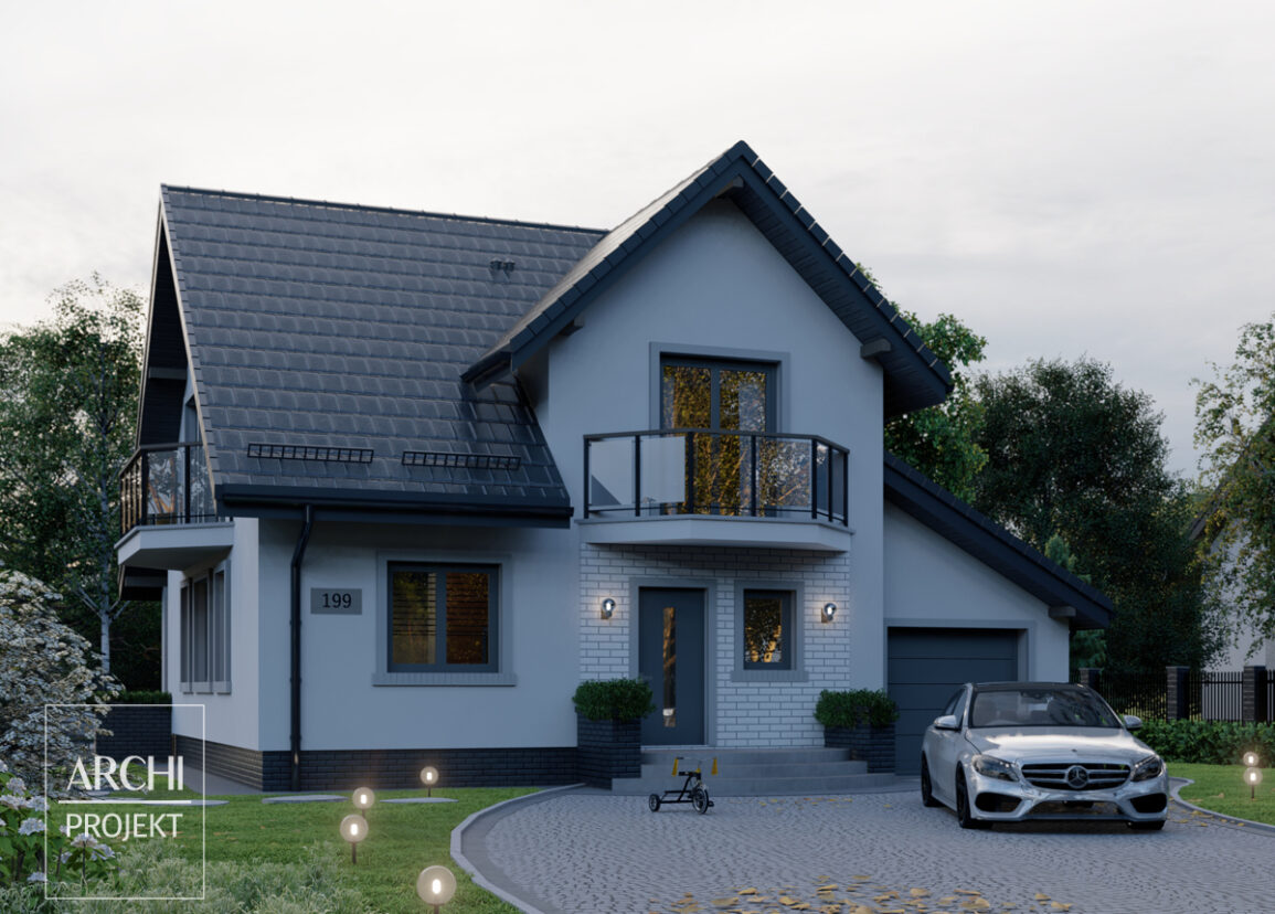 Nieduży, praktyczny dom o atrakcyjnym wyglądzie dla 4-5 osobowej rodziny. Wejście do domu, osłoniete balkonem, prowadzi do wiatrołapu z miejscem na szafę ubraniową. Od strony frontowej znajduje się kuchnia. W głębi domu obszerny pokój dzienny z kominkiem otwiera się na ogród poprzez duży, półkolisty taras. Na parterze, oprócz dużej kuchni z jadalnią i łazienki, znajduje się miejsce na gabinet lub pokój hobby. Część sypialna znajduje się na piętrze - każdy z pokoi ma wyjście na balkon i dostęp do dużej łazienki. Zobacz także projekty: APS 68, APS 94.