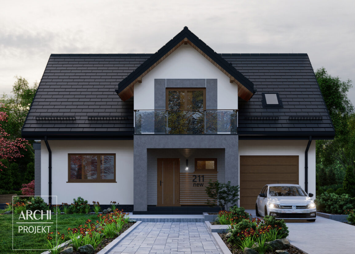 Nowoczesny dom z poddaszem dla 4-5 osobowej rodziny ceniącej wygodę i komfort. i wbudowanym garażem dla rodziny ceniącej wygodę i komfort. Obszerna kuchnia (ze spiżarnią), usytuowana od strony wejściowej, sąsiaduje z ładnym pokojem dziennym posiadającym część jadalną z efektownym wykuszem i część wypoczynkową z kominkiem i kanapami. Szeroki taras z pergolą może być przedłużeniem salonu. Na parterze także: dodatkowy pokój i łazienka przy wejściu. Część sypialna na poddaszu posiada 3 foremne pokoje, dwa bez skosów, z garderobami. Sypialnia małżeńska z balkonem nad wykuszem. Garaż i kotłownia wbudowane w parter domu - połączenie przez korytarz przy wejściu. Zobacz także projekty: APS 161, APS 193, APS 211, APS 212, APS 261.