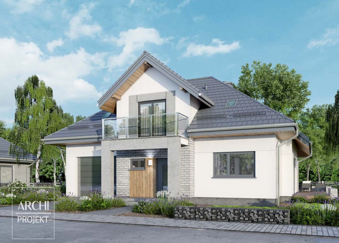 Efektowny, nowoczesny dom z poddaszem i wbudowanym garażem o nowocześnie zaprojektowanym układzie pomieszczeń dla 5-6 osobowej rodziny. Część dzienna z otwartą kuchnią odpowiada współczesnym standardom projektowania domów. Obszerny salon zawiera część jadalną obok kuchni i część wypoczynkową z kominkiem i wyjściem na taras. Szeroki taras od strony ogrodowej jest dodatkowym atutem tego domu. Poddasze zawiera trzy foremne sypialne – każda posiada własną garderobę. Nowoczesny balkon od frontu osłania wejście i dodaje bryle domu wdzięku. Garaż i kotłownia są połączone z domem przez korytarz. Zobacz także projekty: APS 161, APS 193, APS 211, APS 211 NEW, APS 261, APS 289.