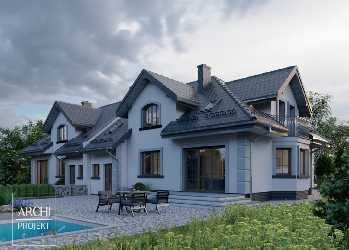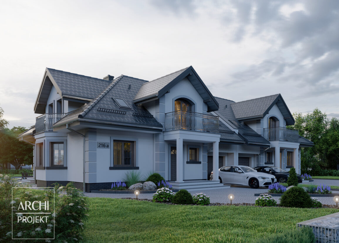Efektowny dom bliźniaczy o przyciągającej wzrok sylwetce ze stylowymi detalami. Każdy segment dla 4-6 osób. Część dzienna jest obszerna i łatwa do adaptacji do indywidualnych potrzeb. Na przykład możliwa zamiana miejscami kuchni i pokoju. Na poddaszu znajdują się trzy sypialnie, ale także strych nad garażem, który można przeznaczyć np. na pomieszczenie mieszkalne lub rekreacyjne. Dom z dużym potencjałem, dzięki przemyślanej konstrukcji. Podane powierzchnie dotyczą 1 segmentu. POWYŻSZA CENA DOTYCZY JEDNEGO SEGMENTU Zobacz także: APS 182