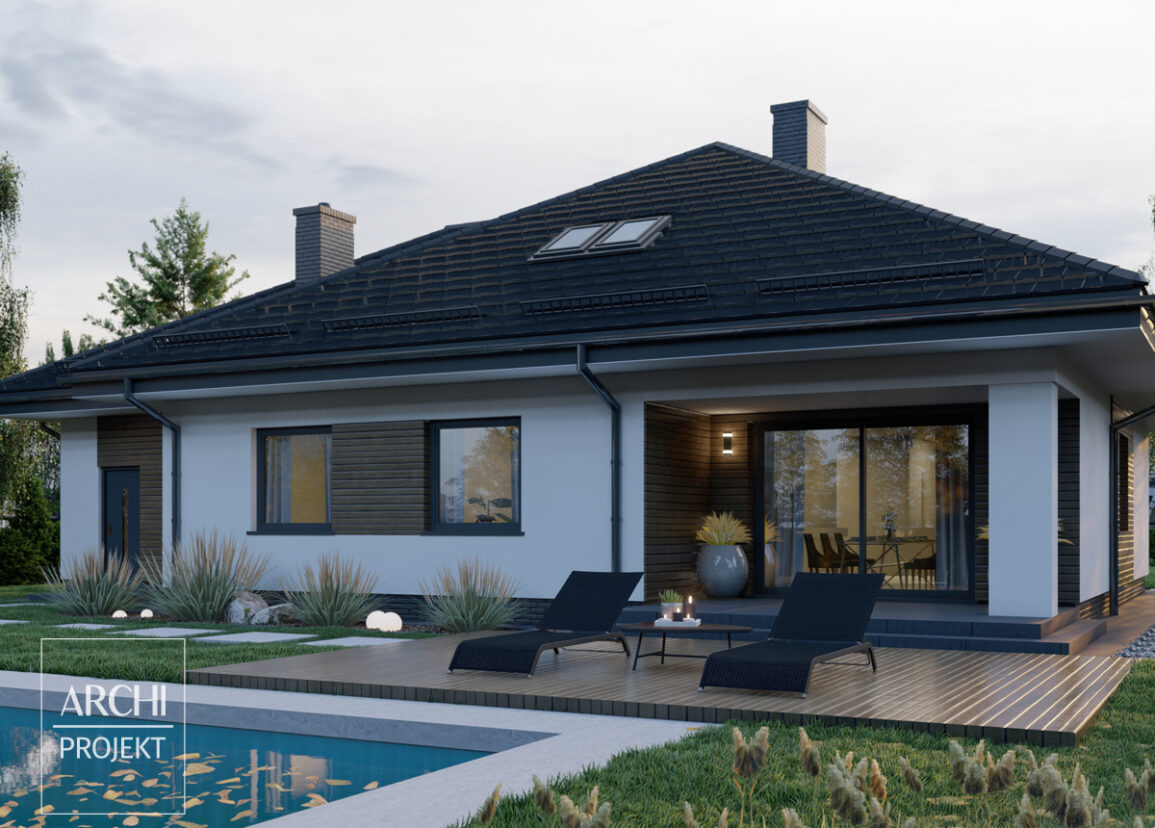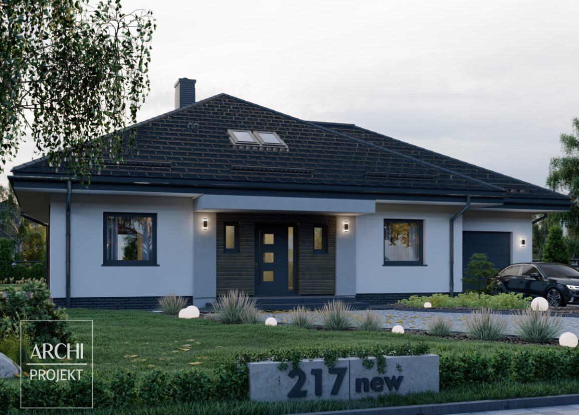 Obszerny parterowy dom dla 4-5 osobowej rodziny ceniącej wygodę mieszkania na jednym poziomie. Wejście do domu, pod łukowym podcieniem, prowadzi do sporego przedsionka z szafami ubraniowymi i dalej do obszernego hallu. Od strony frontowej zlokalizowana jest wygodna kuchnia ze spiżarnią. Przestronny salon z kominkiem i zadaszonym tarasem znajduje się w głębi domu. Pomiędzy kuchnią a salonem - jadalnia w wykuszu. Sypialnie dzieci znajdują się w głębi domu, co zapewnia im niezbędną izolację od wieczornego życia towarzyskiego rodziców. Sypialnia małżeńska - od strony frontowej. W miejscu centralnie umieszczonej garderoby można zlokalizować schody na strych, który można zamienić na poddasze z dodatkowymi sypialniami. Przejście do garażu i kotłowni - poprzez mały przedsionek. Obszerna kotłownia posiada miejsce na sprzęt ogrodowy lub turystyczny. Dostępna jest wersja projektu z garażem dwustanowiskowym. Zobacz także projekt: APS 151, APS 217+2G.