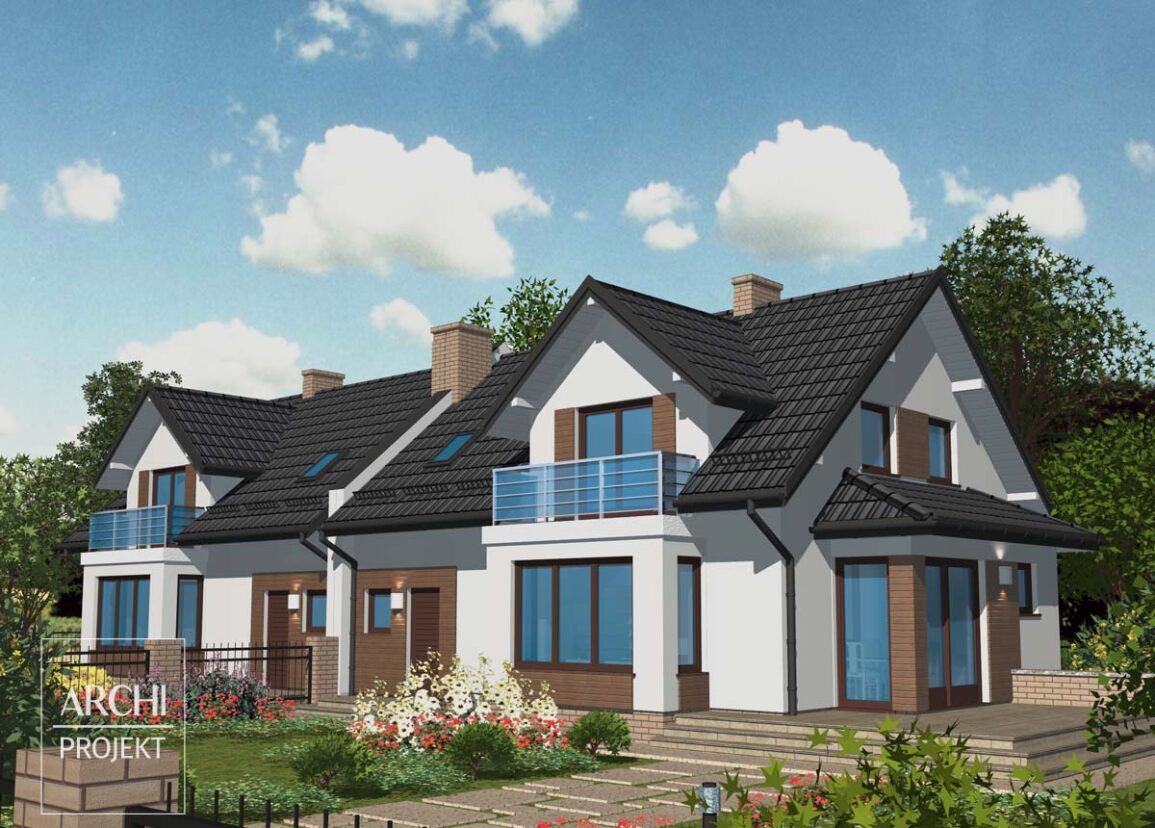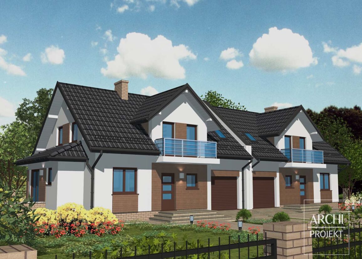 Nowoczesna forma tego bliźniaka zawiera wygodne wnętrze, w którym zamieszkać może 4-ro osobowa rodzina. Wyjątkowo duża, jak na dom tej wielkości, część dzienna składa się, z usytuowanej od frontu, dużej kuchni z wydzieloną spiżarnią, oraz obszernego salonu w głębi domu. Kominek znajdujący się w salonie umili chwile w chłodne dni. Jadalnia, w przeszklonym wykuszu, sąsiaduje z kuchnią. Właśnie z jadalni prowadzą szerokie drzwi na duży taras. Z boku salonu umieszczone zostały otwarte schody, prowadzące na poddasze, gdzie duże sypialnie i duża łazienka zapewnią wygodę mieszkańcom. Salon posiadający dwa wykusze, ma wnętrze pozwalające na niebanalną aranżację tej części domu, która jest jego wizytówką. Część gospodarcza z garażem i kotłownią połączona jest z domem poprzez wiatrołap. POWYŻSZA CENA DOTYCZY JEDNEGO SEGMENTU