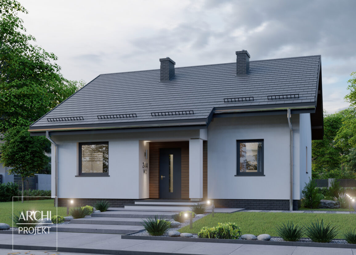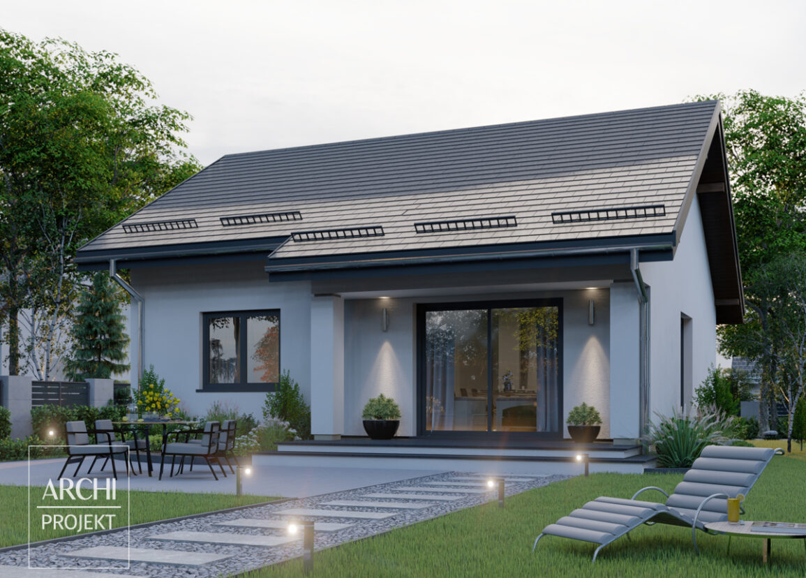 Niewielki nowoczesny dom parterowy o funkcjonalnym wnętrzu i atrakcyjnej sylwetce. Prosta konstrukcja pozwoli wybudować go niewielkim nakładem środków. Duża przestrzeń części dziennej zapewni komfort zarówno domownikom jak i gościom. W części jadalnej możliwe jest dodanie wykusza. Kominek i duży taras to niezbędne elementy komfortowego domu. Sypialnia i łazienka są wygodnymi pomieszczeniami o gabarytach spotykanych w dużo większych domach. W kotłowni możliwe jest umieszczenie pieca na paliwo stałe. Możliwa jest modyfikacja gabarytów domu - podczas adaptacji projektu.