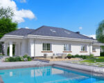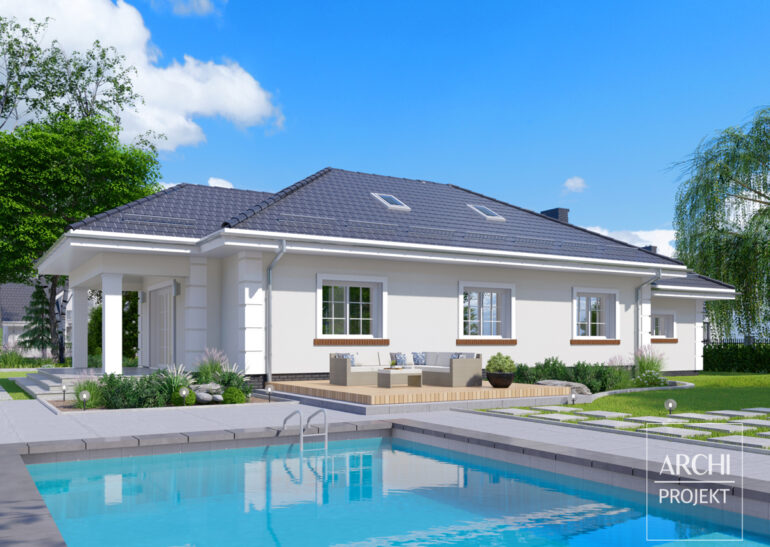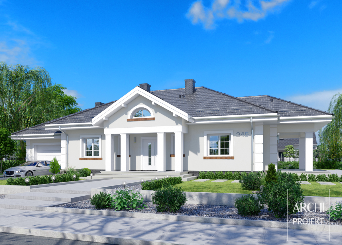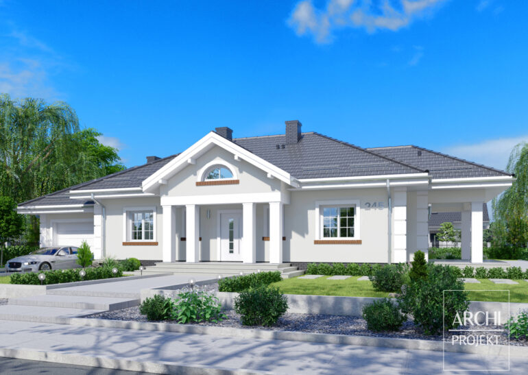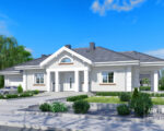 Stylowy parterowy dom o atrakcyjnej sylwetce i funkcjonalnym wnętrzu dla 4-5 osobowej rodziny szukającej komfortowego parterowego domu. Dom szczególnie nadaje się na płytką działkę. Pomimo stosunkowo niewielkiej powierzchni użytkowej zawiera obszerną część dzienną z wygodną kuchnią (z wydzieloną spiżarnią) i dużym pokojem dziennym. Część jadalna salonu usytuowana jest w wykuszu, którego przedłużeniem jest duży zadaszony taras, potrzebny w naszym klimacie. Część sypialna zawiera 3 sypialnie i wygodną łazienkę. Kotłownia i garaż znajdują się obok części sypialnej. Garaż może być jedno- lub dwustanowiskowy.