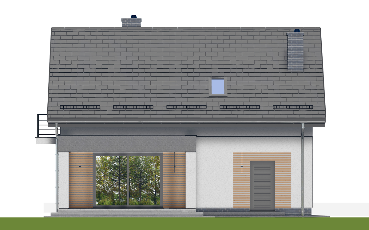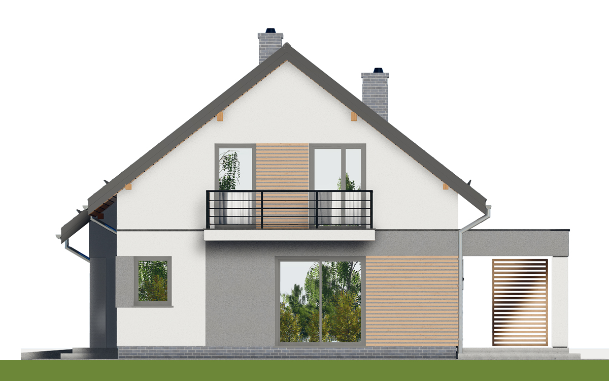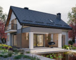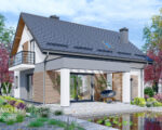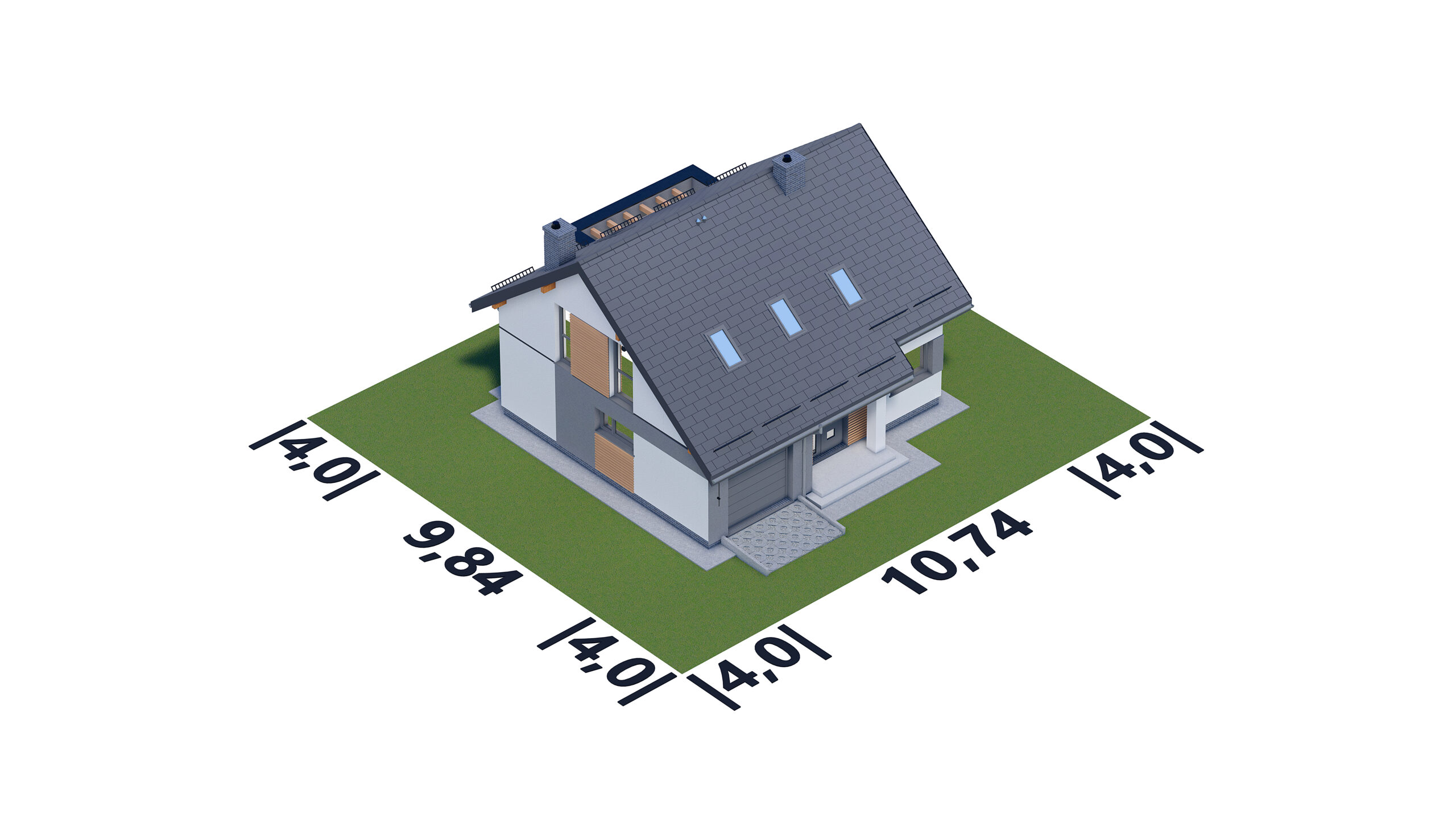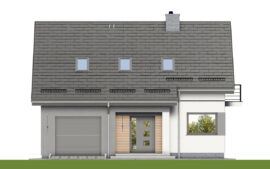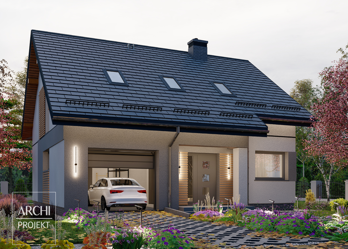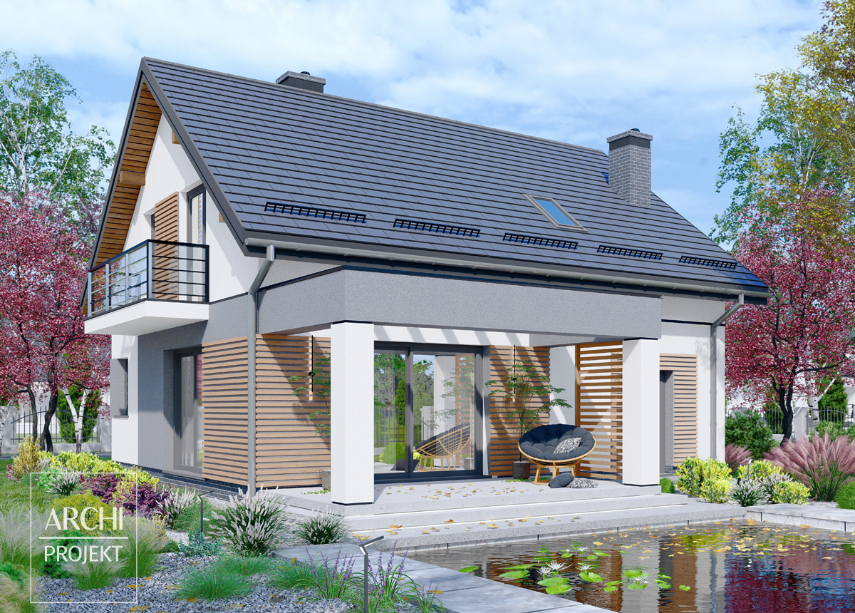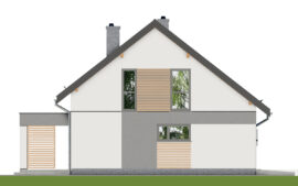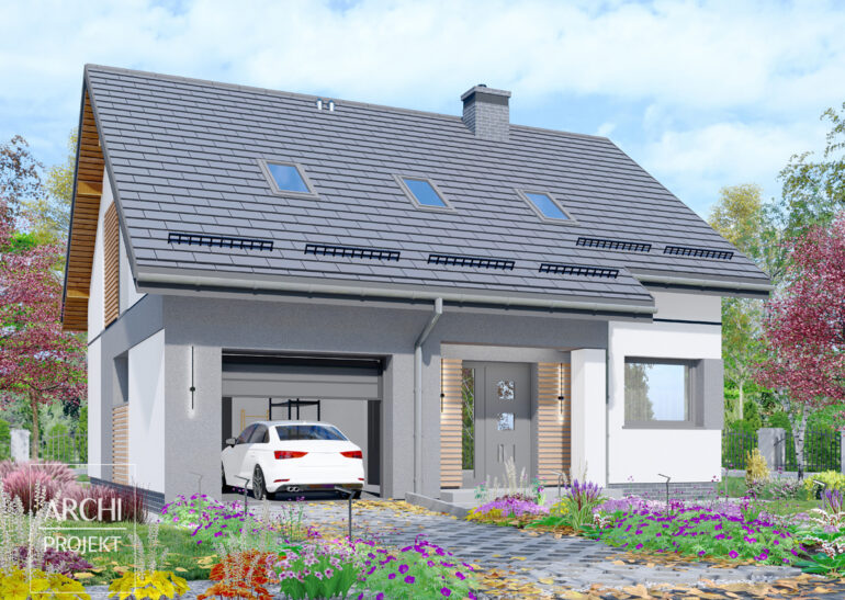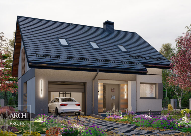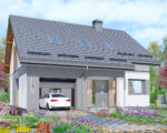 Budynek mieszkalny jednorodzinny, wolnostojący, parterowy, z poddaszem użytkowym, niepodpiwniczony. Zgrabny, wygodny dom przeznaczony dla 4-5 osobowej rodziny. Zwarta bryła domu zawiera na parterze część dzienną z wygodną kuchnią, zgrabnym salonem oraz garażem i kotłownią. Taras na przedłużeniu salonu jest osłonięty pergolą. Schody połączone z przestrzenią salonu prowadzą na poddasze, które zawiera trzy wyjątkowo przestronne sypialnie, dużą łazienkę oraz pralnię. Sypialnia główna posiada własną garderobę. Dzięki zwartej, ekonomicznej konstrukcji budynek jest łatwy i niedrogi w realizacji.