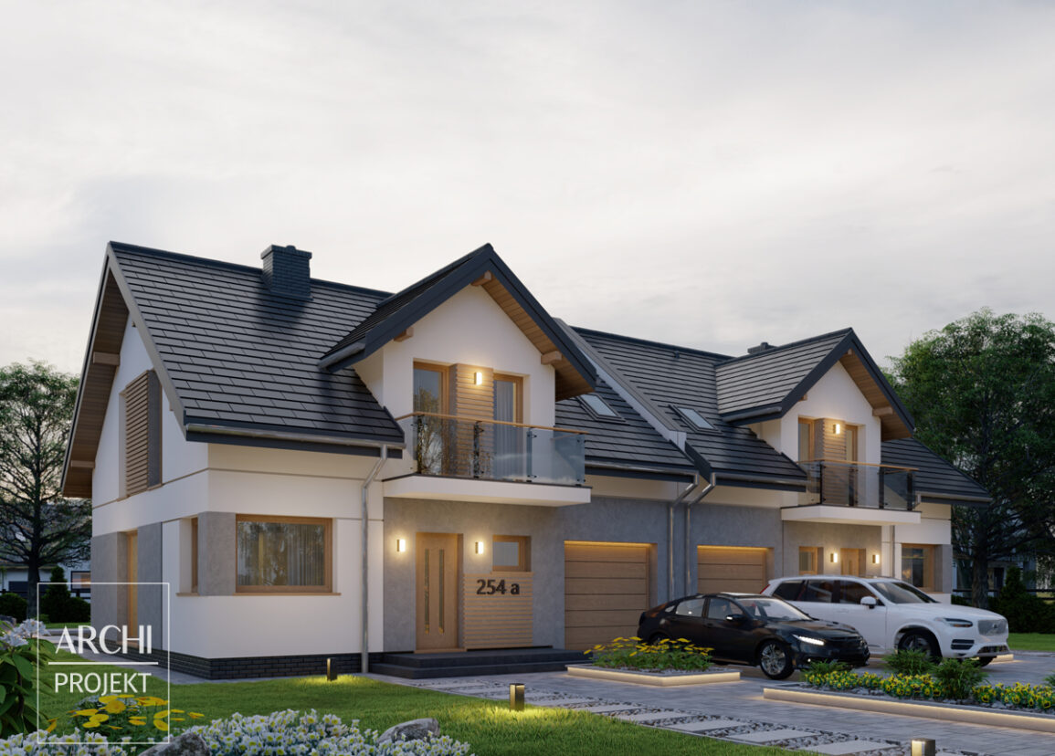 Zgrabny, wygodny dom dwulokalowy (składający się z dwóch bliźniaczych segmentów), przeznaczony dla 4-5 osobowej rodziny. Oba segmenty połączone garażami. Zwarta bryła domu zawiera na parterze część dzienną z wygodną kuchnią i zgrabnym salonem. Taras na przedłużeniu salonu jest osłonięty balkonem. Schody połączone z przestrzenią salonu prowadzą na poddasze, które zawiera trzy wyjątkowo przestronne sypialnie z balkonami i dużą łazienkę. Dzięki zwartej, ekonomicznej konstrukcji budynek jest łatwy i niedrogi w realizacji. Podane powierzchnie dotyczą 1 segmentu. Zobacz także: APS 209, APS 238. POWYŻSZA CENA DOTYCZY JEDNEGO SEGMENTU