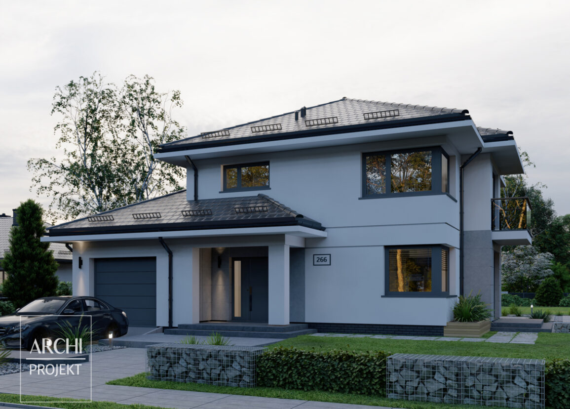 Nowoczesny, piętrowy dom o funkcjonalnym wnętrzu dla 4-6 osobowej rodziny. Dom posiada dwie pełne kondygnacje – parter oraz piętro. Na parterze od strony frontowej usytuowana jest kuchnia sąsiadująca z efektownym pokojem dziennym z kominkiem i narożnymi oknami, oraz wyjściem na bardzo obszerny, częściowo osłonięty balkonem taras. Na parterze także: dodatkowa sypialnia (pokój gościnny), mała łazienka, garaż i kotłownia. Na piętrze mieszczą się: cztery foremne sypialnie i wygodna łazienka. Zobacz także projekty: APS 274, APS 275. Udany projekt domu, którego zaletami są funkcjonalność oraz atrakicyjna sylwetka. Wkrótce wersja z garażem dwustanowiskowym - APS 266+2G.