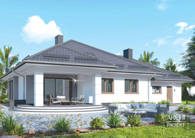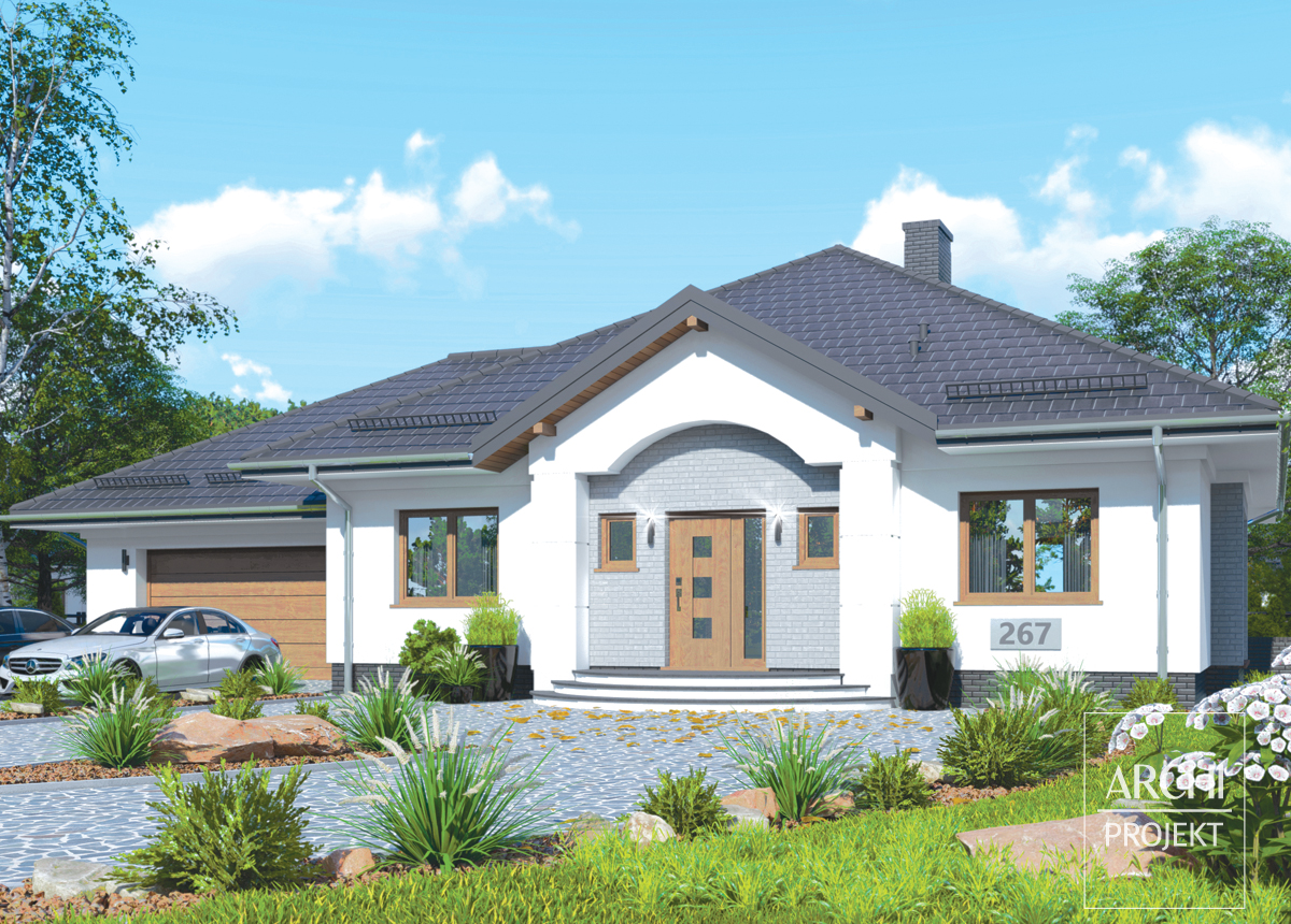 Przestronny parterowy dom dla rodziny ceniącej wygodę mieszkania na jednym poziomie. Wejście do domu podkreślone arkadą prowadzi do hallu i dalej do reprezentacyjnej części dziennej. W głębi domu - salon z wykuszem, kominkiem i dużym zadaszonym tarasem - bardzo przydatnym w ciepłe dni. Od frontu - wygodna kuchnia z wydzieloną spiżarnią. Sypialnie znajdują się w drugiej wydzielonej części domu, co zapewnia im niezbędną izolację od hałasu. Dla części sypialnej zaprojektowano komfortową łazienkę. Garaż dwustanowiskowy, to coraz częściej zarówno standard jak i konieczność. Zobacz także: APS 151+2G, APS 180+2G, APS 217.