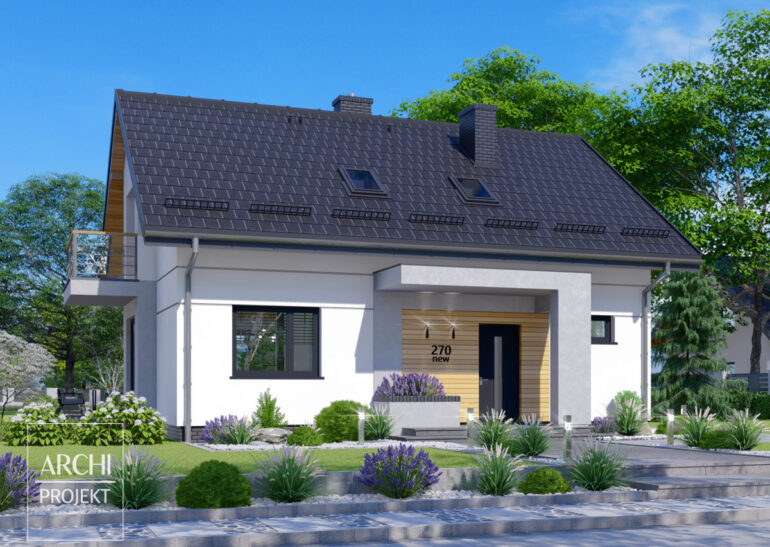 APS 270 NEW to tani w budowie i użytkowaniu dom o nowoczesnej stylistyce i komfortowych wnętrzach. Wejście do domu osłonięte jest nowoczesnym zadaszeniem i prowadzi do przedsionka z miejscem na dużą szafę garderobianą. Strefa dzienna została zaprojektowana jako jednoprzestrzenna - znajduje się tu salon, jadalnia