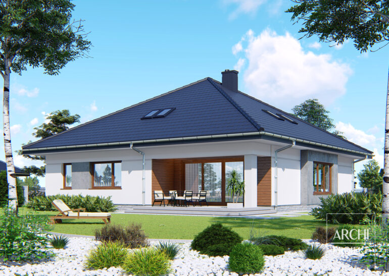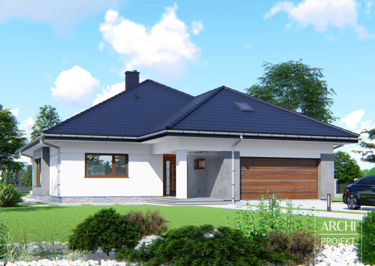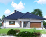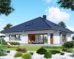 Funkcjonalny dom parterowy zaprojektowany dla 3-4 osobowej rodziny. Wejście do domu, osłonięte ścianą garażu, izoluje od niekorzystnych warunków atmosferycznych i hałasu. Przedsionek z miejscem na szafę ubraniową prowadzi do przestronnej części dziennej. Foremna kuchnia (z wydzieloną spiżarnią) łączy się przestrzennie z jadalnią i salonem. W dużym salonie nie zabrakło miejsca na kominek oraz wyjście na narożny osłonięty dachem taras, którego powierzchnia wystarczy na ustawienie dużego stołu. Część sypialna stanowi wyraźnie wydzieloną część i zawiera dwie ustawne sypialnie (sypialnia małżeńska z dużą garderobą) i przestronną łazienkę. Schody na poddasze umożliwiają swobodną adaptację części strychu na pomieszczenia użytkowe, dodatkowe 2-3 pokoje i łazienkę. Część gospodarcza z kotłownią, oraz garaż dwustanowiskowy połączone są z częścią mieszkalną poprzez wiatrołap. Zobacz także: APS 152, APS 153, APS 264, APS 269, APS 272.
