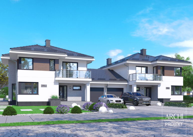 Zaprojektowany w nowoczesnej estetyce piętrowy dom bliźniaczy o zgrabnej sylwetce i funkcjonalnym wnętrzu dla 4-6 osobowej rodziny. Dom posiada dwie pełne kondygnacje - parter oraz piętro. Na parterze od strony frontowej usytuowana jest obszerna kuchnia ze spiżarnią i miejscem na małą jadalnię. Kuchnia sąsiaduje z częścią jadalną salonu - w wykuszu. Kominek pomiędzy kuchnią i jadalnią jest w centralnym miejscu domu i może ogrzewać także inne pomieszczenia. W głębi domu efektowny pokój dzienny z narożnymi oknami oraz wyjściem na obszerny, częściowo osłonięty balkonem taras. Na parterze także: dodatkowa sypialnia (pokój gościnny) i łazienka. Garaż łączy się z kotłownią. Piętro równie obszerne jak parter zawiera: cztery duże foremne sypialnie i wygodną łazienkę. Zobacz także projekty: APS 266, APS 274, APS 275.