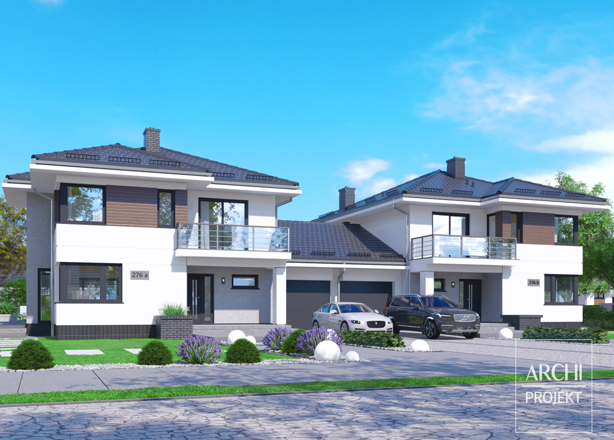 Zaprojektowany w nowoczesnej estetyce piętrowy dom bliźniaczy o zgrabnej sylwetce i funkcjonalnym wnętrzu dla 4-6 osobowej rodziny. Dom posiada dwie pełne kondygnacje - parter oraz piętro. Na parterze od strony frontowej usytuowana jest obszerna kuchnia ze spiżarnią i miejscem na małą jadalnię. Kuchnia sąsiaduje z częścią jadalną salonu - w wykuszu. Kominek pomiędzy kuchnią i jadalnią jest w centralnym miejscu domu i może ogrzewać także inne pomieszczenia. W głębi domu efektowny pokój dzienny z narożnymi oknami oraz wyjściem na obszerny, częściowo osłonięty balkonem taras. Na parterze także: dodatkowa sypialnia (pokój gościnny) i łazienka. Garaż łączy się z kotłownią. Piętro równie obszerne jak parter zawiera: cztery duże foremne sypialnie i wygodną łazienkę. Zobacz także projekty: APS 266, APS 274, APS 275.