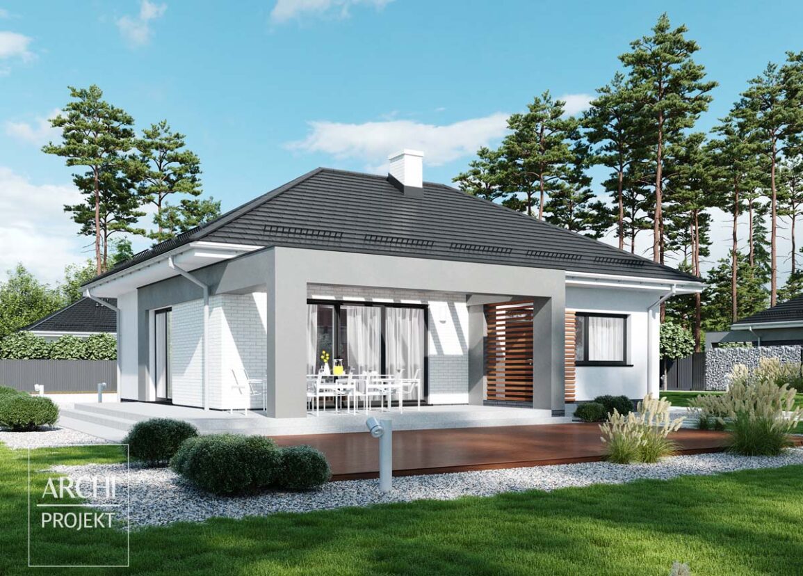 APS 285 to nieduży parterowy dom o zwartej bryle i funkcjonalnym wnętrzu. Czterospadowy dach i nowoczesne detale nadają mu wyjątkowego charakteru.