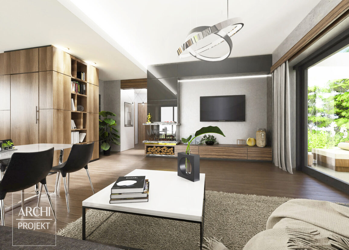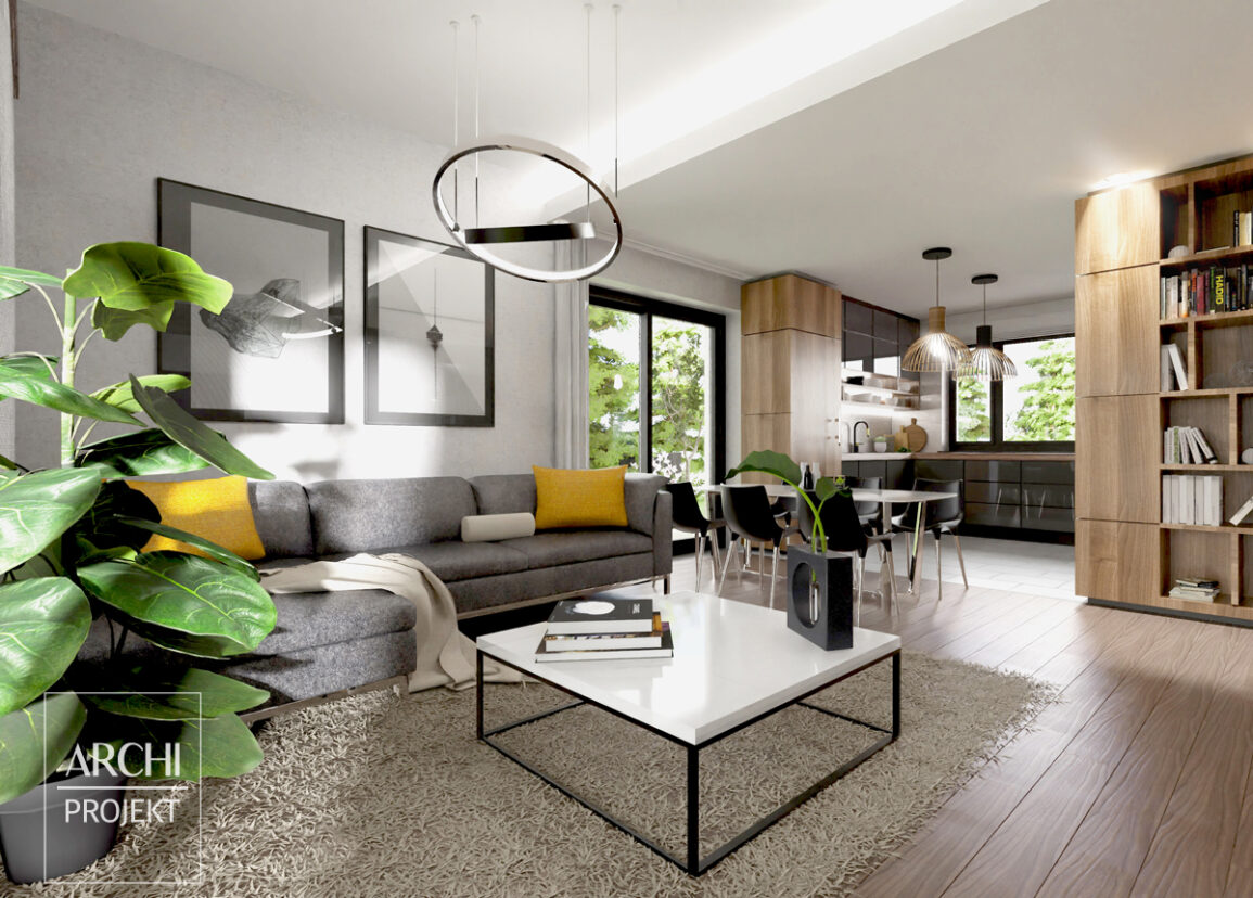 Część dzienna domu składa się z wygodnej kuchni ze spiżarką i obszernego salonu połączonego z jadalnią. Duże przeszklenia wychodzą na ogród i optycznie powiększają salon i jadalnię. Szeroki taras osłonięty jest pergolą, którą można przystosować do ochrony tarasu przed słońcem i deszczem. Dom jest niewielki, ale wszystkie pomieszczenia mają komfortowe powierzchnie - salon to prawie 30m², sypialnie mają 12-14m². Część sypialna i dzienna domu są wyraźnie od siebie oddzielone, aby zapewnić prywatność domownikom. Dwie przestronne sypialnie i komfortowa łazienka zapewnią wygodę 3-4 osobowej rodzinie.