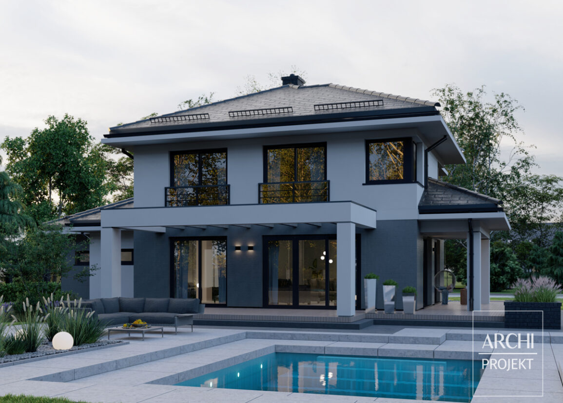 Nowoczesny, piętrowy dom o funkcjonalnym wnętrzu dla 4-6 osobowej rodziny, z garażem dwustanowiskowym. Dom posiada dwie pełne kondygnacje – parter oraz piętro. Na parterze od strony frontowej usytuowana jest kuchnia ze spiżarnią sąsiadująca z obszernym pokojem dziennym z dużymi powierzchniami drzwi tarasowych. Narożny taras zadaszony jest zarówno przed jadalnią jak i częścią wypoczynkową. Na parterze także: dodatkowa sypialnia (pokój gościnny), mała łazienka, garaż dwustanowiskowy i kotłownia. Na piętrze mieszczą się: trzy foremne sypialnie, garderoba i dwie łazienki. Dostępna jest także wersja z jednym garażem. Zobacz także podobne projekty: APS 266+2G, APS 274+2G.
