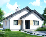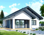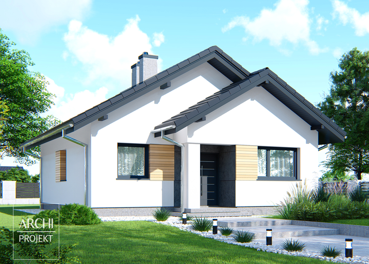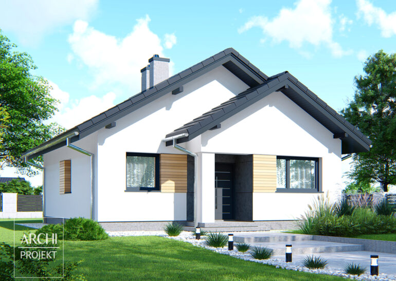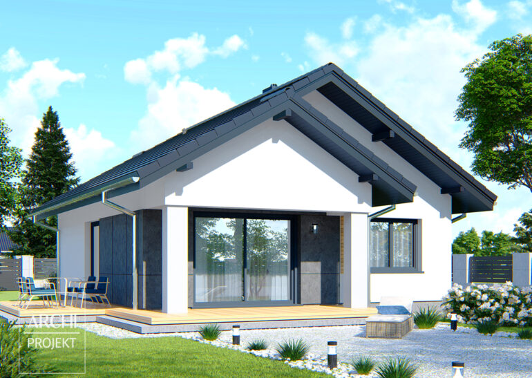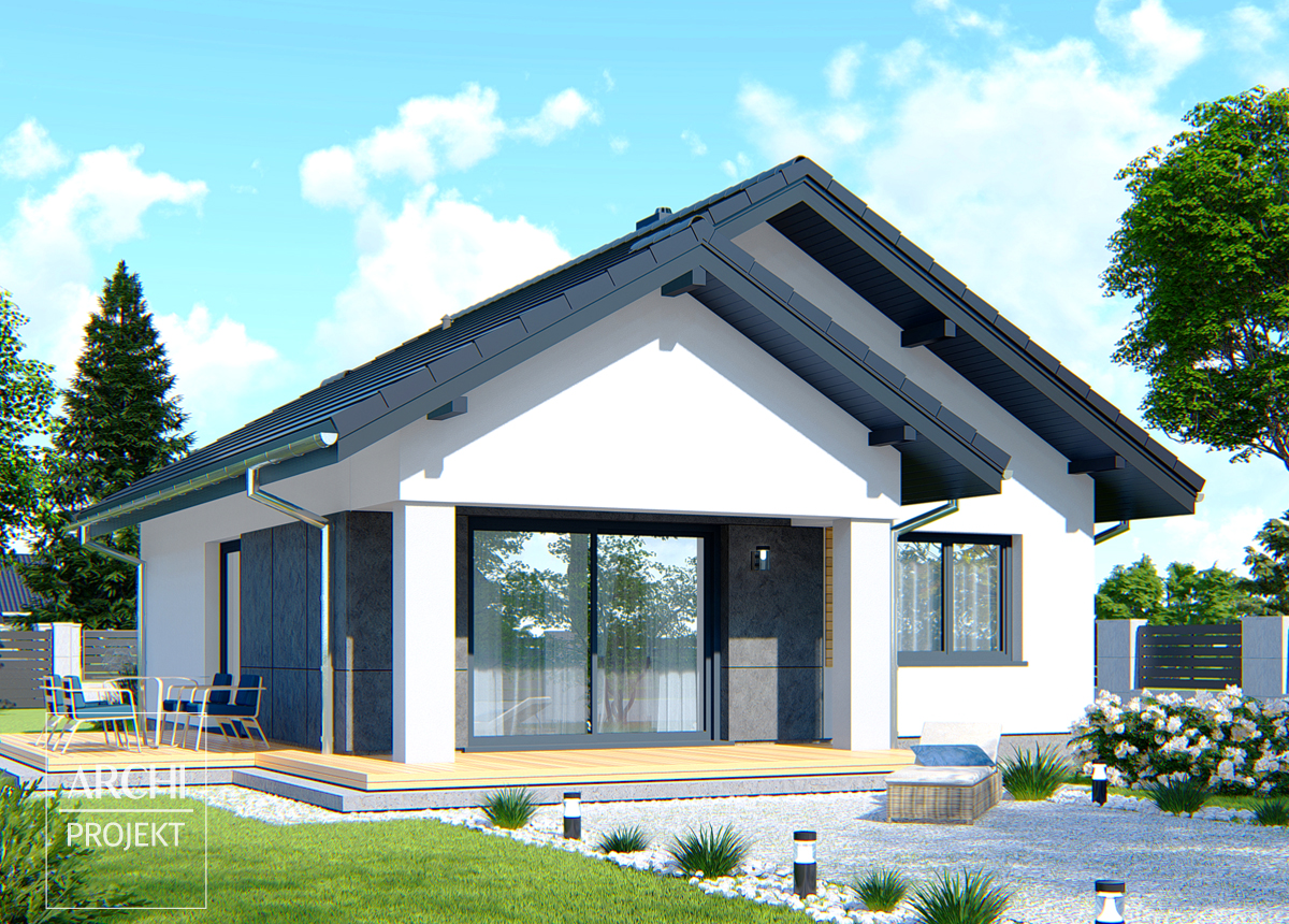 Zgrabny, niewielki parterowy dom o nowoczesnej sylwetce i funkcjonalnym wnętrzu. Część dzienna domu składa się z wygodnej kuchni, z oknem od strony frontowej i obszernego salonu z częścią jadalną i wypoczynkową. Duże drzwi tarasowe optycznie powiększają salon i jadalnię. Tak obszerny salon w niedużym domu to wielka zaleta. Duży taras osłonięty jest częściowo wydłużonym dachem, który stanowi ochronę przed słońcem i deszczem. W salonie kominek może wspomagać ogrzewanie domu w chłodniejszych porach roku. Część sypialna domu to dwuosobowa sypialnia i łazienka, oddzielone od reszty domu aby zapewnić prywatność domownikom. Dostępna jest wersja z garażem oraz wersja z piwnicą i poddaszem.