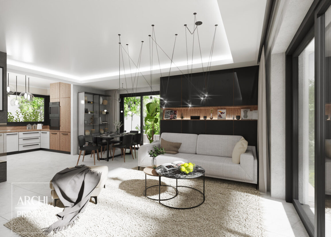 Efektowny dom, o nowoczesnej, harmonijnej sylwetce dla 4-5 osobowej rodziny, z garażem wkomponowanym w bryłę domu. Wejście do domu osłonięte daszkiem prowadzi do przedsionka z szafą ubraniową i miejscem na buty. Szerokość przedsionka pozwala na wygodne przebranie się. Otwarty układ funkcjonalny strefy dziennej odpowiada współczesnym tendencjom w projektowaniu domów. Nowocześnie zaprojektowana strefa dzienna składa się