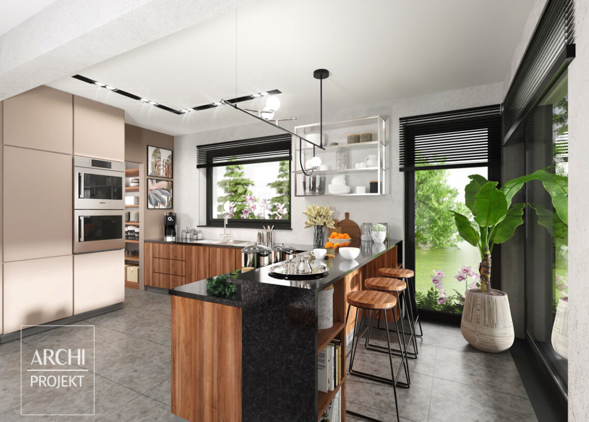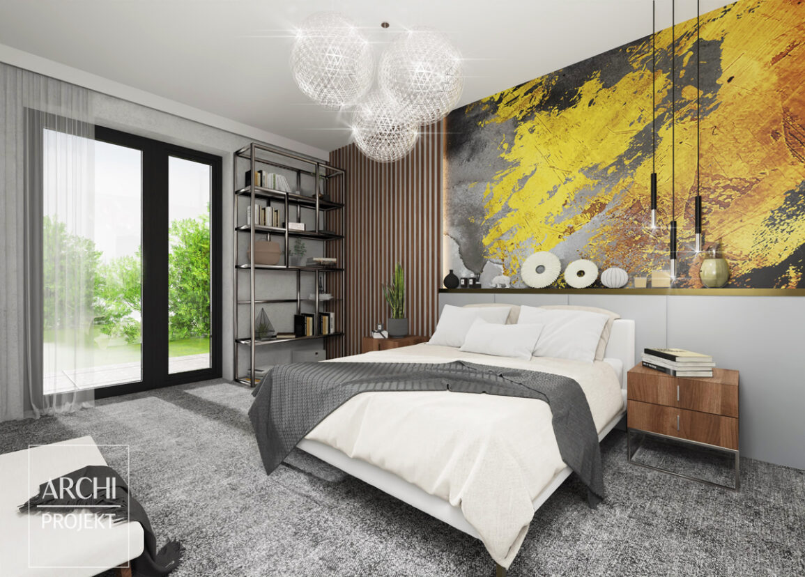 APS 325 wariant 2 to wygodny parterowy dom, który wyróżnia układ funkcjonalny z wyraźnym podziałem na strefy i efektowna bryła. W dużej kuchni wyspa kuchenna może stać się idealnym miejscem na śniadania lub przekąski. Tuż przy niej znajdują się wysokie przeszklenia, które otwierają wnętrze na ogród. Salon i jadalnia są przestronne, a dodatkowo połączone z zadaszonym tarasem, który znajduje się na ich przedłużeniu. Na jednej ze ścian salonu znajduje się centralnie zlokalizowany kominek, a po obydwu jego stronach wysokie przeszklenia - taka aranżacja będzie z pewnością ozdobą strefy dziennej. W głębi domu znajduje się część sypialniana - cztery wygodne sypialnie, w tym jedna z własną garderobą i wyjściem na taras. Tą część domu można wydzielić drzwiami.