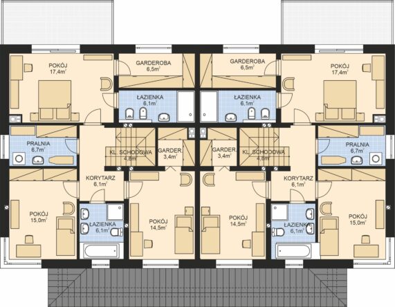 Jeden segment: 4 sypialnie, pokój dzienny, kuchnia, 3 łazienki, pralnia, 2 garderoby, garaż, kotłownia