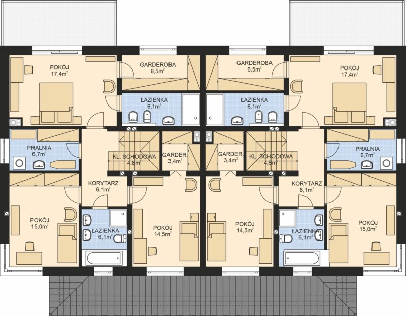 Jeden segment: 4 sypialnie, pokój dzienny, kuchnia, 3 łazienki, pralnia, 2 garderoby, garaż, kotłownia