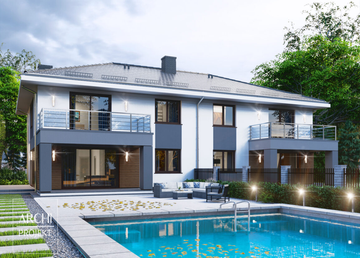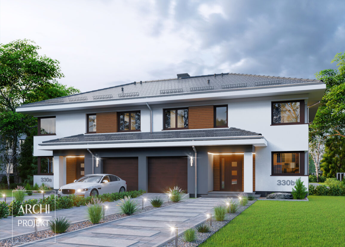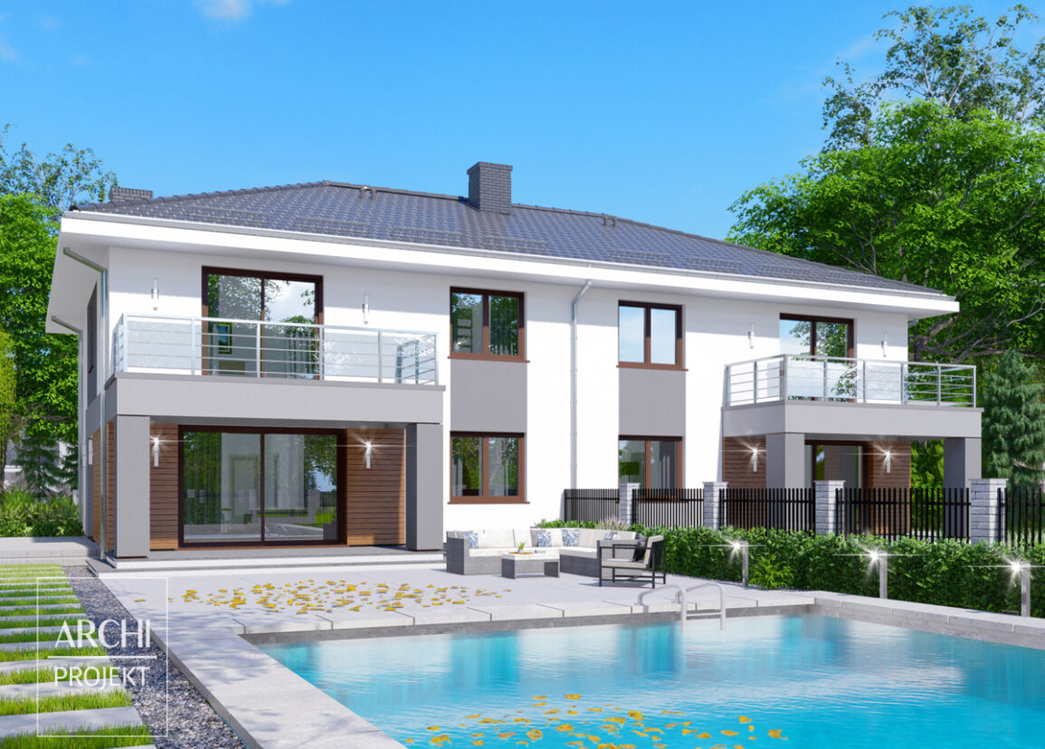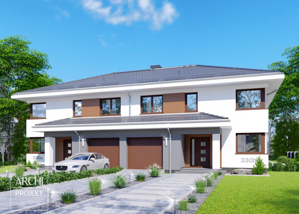 Nowoczesny piętrowy dom dwulokalowy, o atrakcyjnej sylwetce i funkcjonalnym wnętrzu. Zwarta bryła domu, z wbudowanym garażem, została tak zaprojektowana, żeby zmieścić się na działce o szerokości poniżej 28m. Mimo niedużej szerokości dom ma dobrze rozplanowane wnętrze z wygodną częścią dzienną na parterze, w skład której wchodzi kuchnia - zlokalizowana od strony wejściowej - oraz połączony z nią obszerny pokój dzienny - z kominkiem i wyjściem na zadaszony taras. Na parterze jest jeszcze dodatkowy pokój - do wykorzystania jako gabinet lub pokój gościnny. Na piętrze znajdują się trzy foremne sypialnie (sypialnia małżeńska z łazienką, garderobą i wyjściem na duży taras), garderoby, łazienki i pralnia. Garaż i kotłownia połączone z domem przez przejście z wiatrołapu. Dom, dzięki prostej konstrukcji będzie łatwy w budowie oraz tańszy w eksploatacji - dzięki zwartej bryle i wyposażeniu we wbudowany garaż.