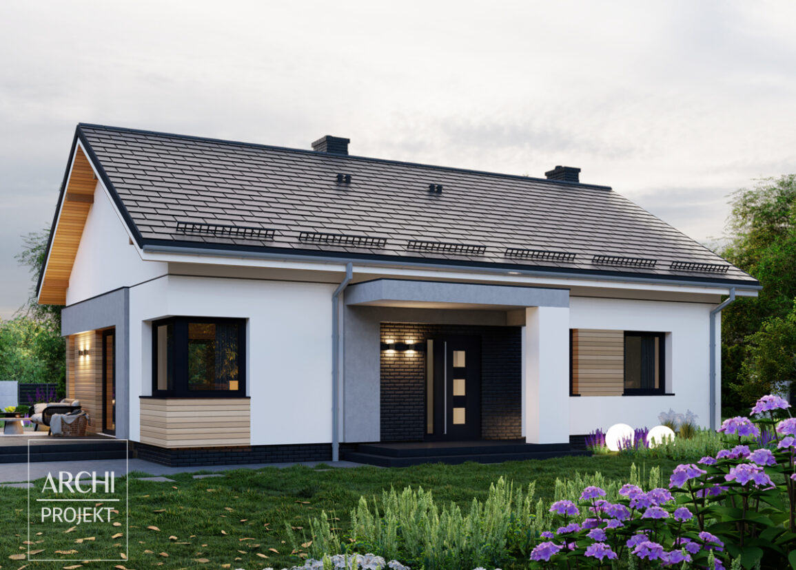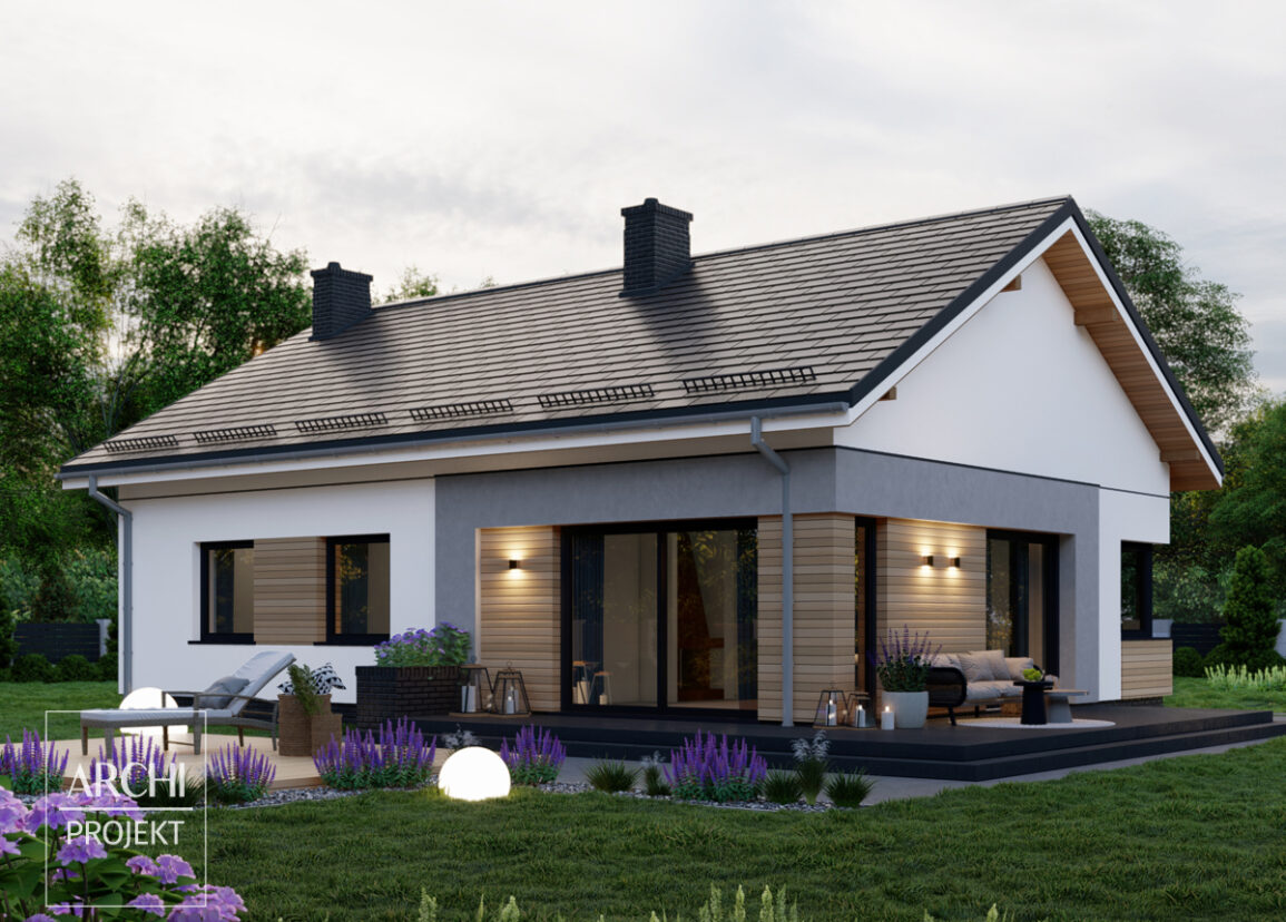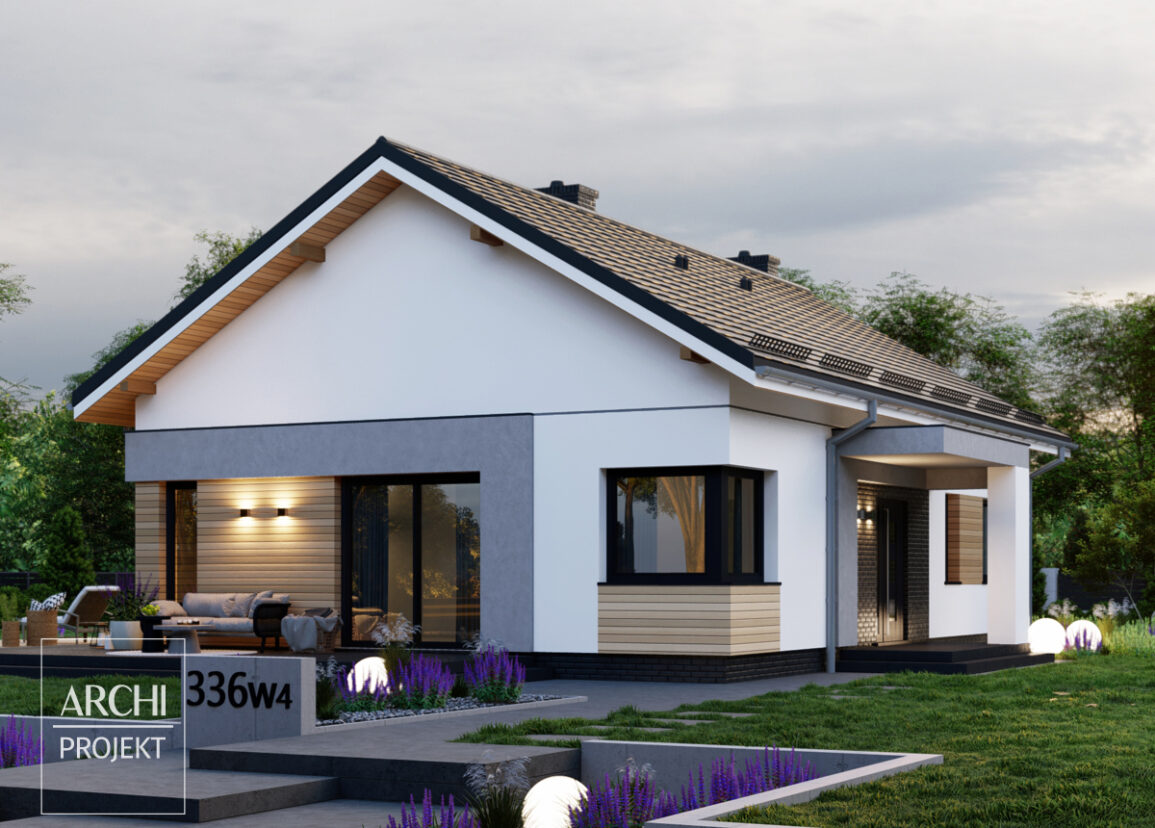 APS 336 wariant 4 to dom parterowy o nowoczesnej bryle, przykryty dwuspadowym dachem. Zaletą domu jest prosty układ konstrukcyjny, dzięki któremu jest on tani w budowie - ma on regularny, prostokątny kształt, nieskomplikowany dach i przemyślany układ funkcjonalny. Część dzienna APS 336 wariant 4 zawiera przestrzenny pokój dzienny połączony z jadalnią i kuchnią. Kuchnia z nowoczesnym, narożnym oknem może być otwarta, lub oddzielona od salonu ścianką. W APS 336 wiariant 4 zaprojektowano salon, który dzięki dużym przeszkleniom łączy się wizualnie z narożnym tarasem. Taras osłania nowoczesna pergola, która dodaje budynkowi wyjątkowego charakteru. Część sypialna domu składa się z trzech wygodnych sypialni i dużej łazienki, która pomieści zarówno prysznic, jak i wannę. Pralnia znajduje się w pojemnej kotłowni.