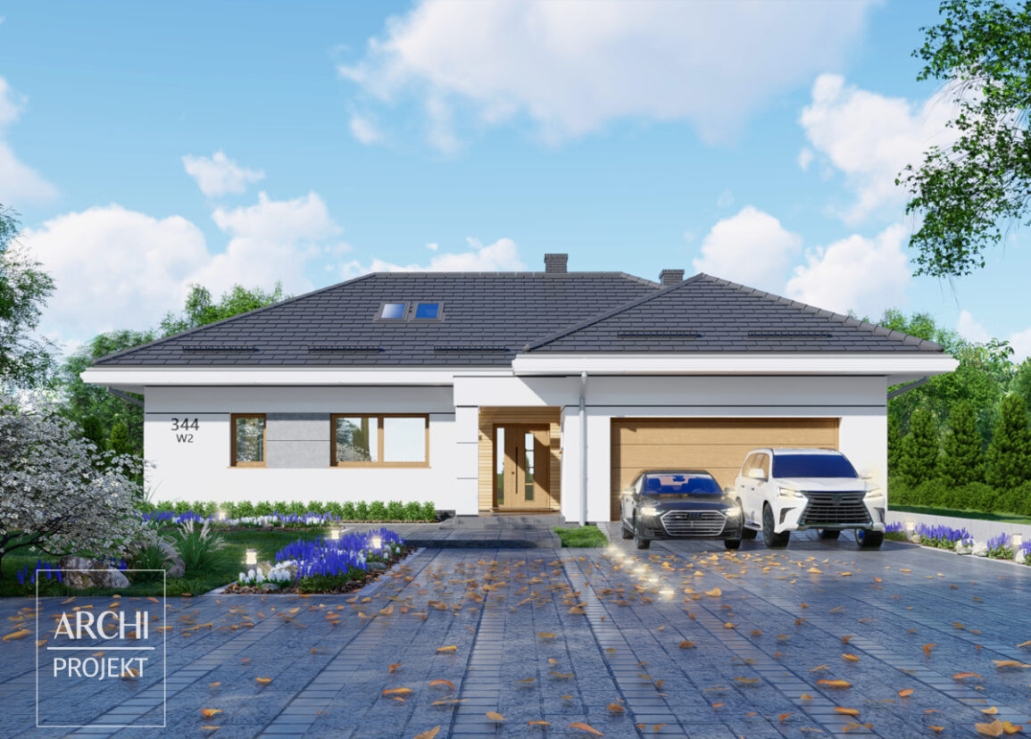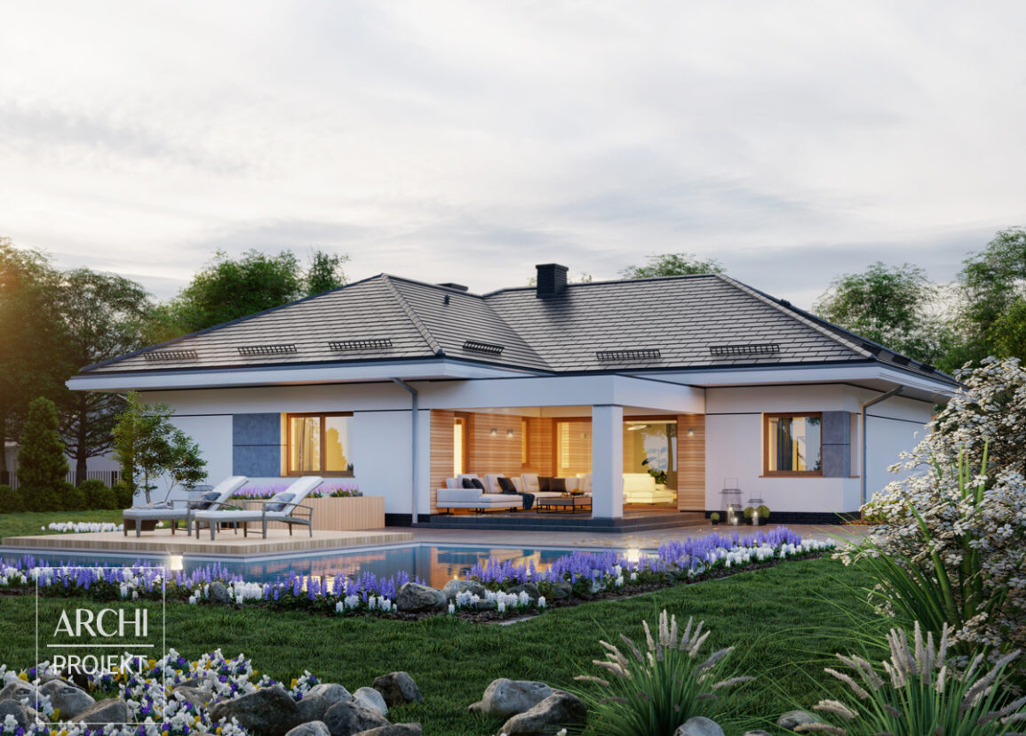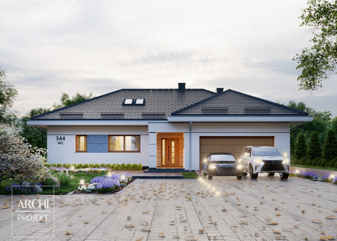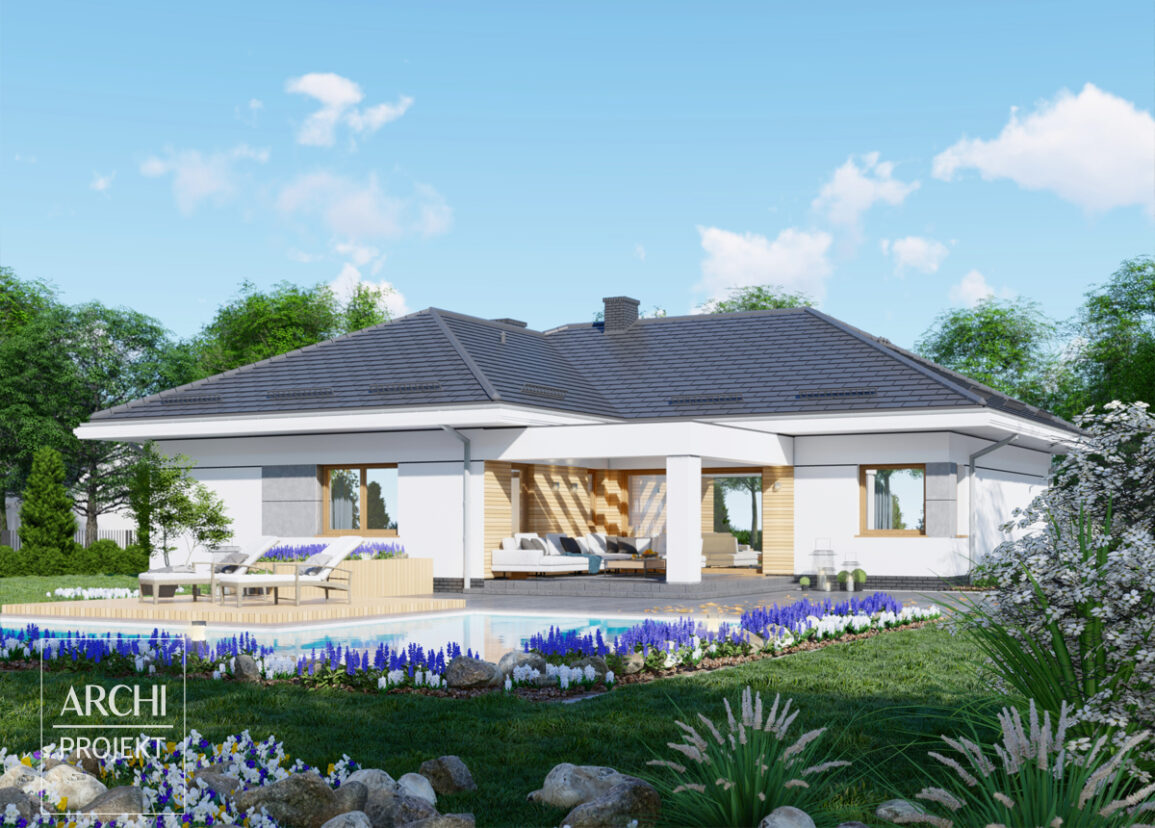 Budynek mieszkalny jednorodzinny, wolno stojący, parterowy, z poddaszem nieużytkowym, niepodpiwniczony. Nowoczesny, wygodny dom, dla 4-5 osobowej rodziny, z garażem dwustanowiskowym wkomponowanym w bryłę budynku. Wejście do domu prowadzi do obszernego wiatrołapu i dalej do centralnie usytuowanego salonu. Kuchnia zlokalizowana jest od frontu. Przestronny pokój dzienny, posiadający wyjście na duży, narożny taras, znajduje się w centralnej części domu. Część sypialna zawiera trzy pokoje i łazienkę, sypialnia małżeńska z garderobą i łazienką znajduje się w osobnym skrzydle domu. Do kotłowni prowadzi przejście z korytarza w głębi budynku. Garaż usytuowany jest w poziomie zbliżonym do poziomu terenu. Istnieje możliwość (w ramach adaptacji projektu) dostosowania poddasza do celów mieszkalnych – w tej sytuacji konieczne będzie podniesienie ścianki kolankowej.