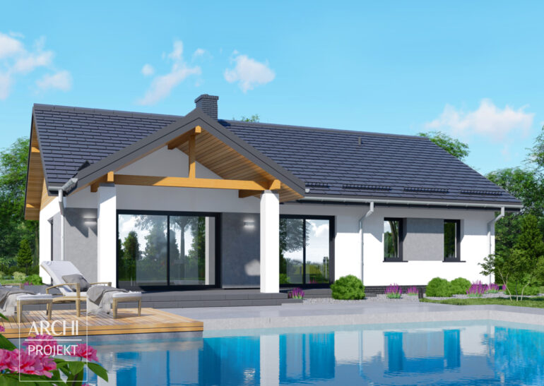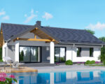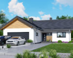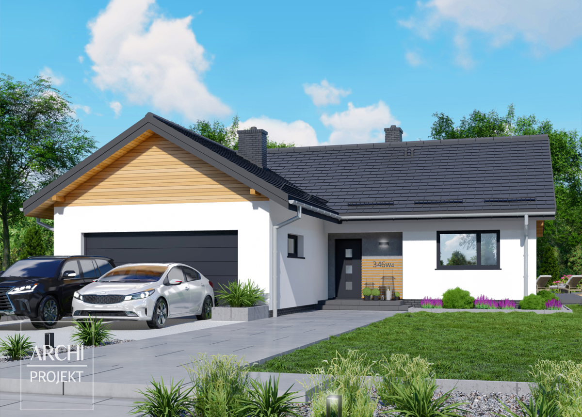 APS 346 wariant 3 to nowoczesny parterowy dom, o atrakcyjnej, harmonijnej sylwetce dla 4-5 osobowej rodziny, z garażem dwustanowiskowym wkomponowanym w bryłę domu. Wejście do domu osłonięte podcieniem prowadzi do przedsionka z szafą i dalej do części dziennej. Otwarty układ funkcjonalny strefy dziennej odpowiada współczesnym tendencjom w projektowaniu domów. Nowocześnie zaprojektowana strefa dzienna składa się z połączonych wnętrz kuchni, jadalni i salonu. Wyjście na narożny taras możliwe jest zarówno z salonu jak i jadalni oraz sypialni małżeńskiej. Z wiatrołapu - przejście do kotłowni i garażu. Część sypialna zlokalizowana jest w odizolowanej części domu, gdzie znajdują się trzy foremne sypialnie i dwie dobrze wyposażone łazienki. Sypialnia małżeńska posiada garderobę.