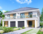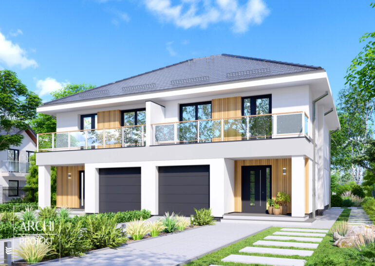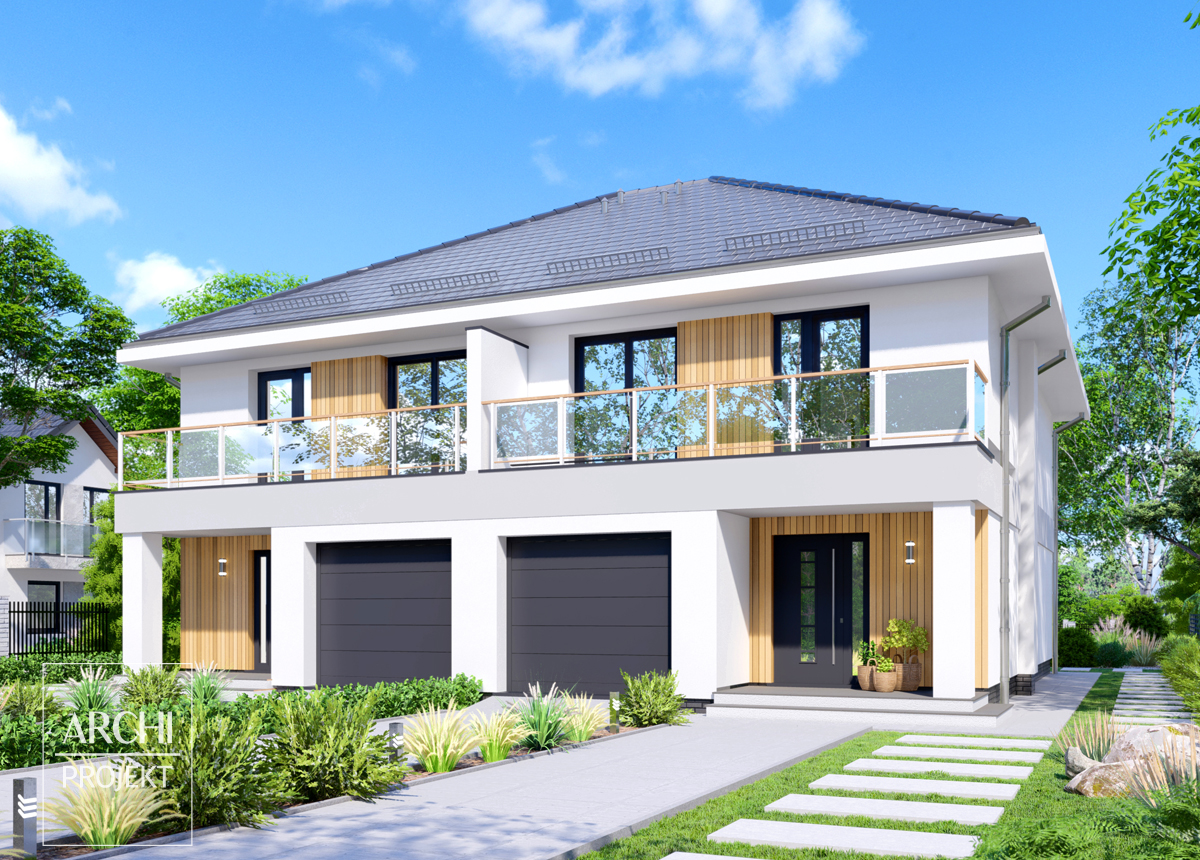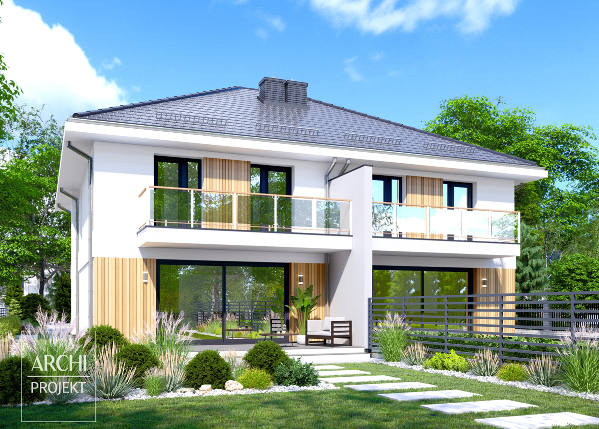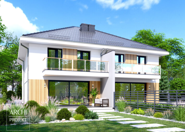 Nowoczesny piętrowy dom, o atrakcyjnej, harmonijnej sylwetce dla 4-5 osobowej rodziny. Wejście do domu osłonięte balkonem prowadzi do wiatrołapu i dalej do części dziennej. Otwarty układ funkcjonalny strefy dziennej odpowiada współczesnym tendencjom w projektowaniu domów. Nowocześnie zaprojektowana strefa dzienna składa się z połączonych wnętrz kuchni, jadalni i salonu. Z salonu wyjście na obszerny, częściowo zadaszony balkonem taras. Na parterze mieści się ponadto łazienka oraz garaż jednostanowiskowy. Część sypialna zlokalizowana jest na piętrze, gdzie znajdują się cztery foremne sypialnie i przestronna łazienka.