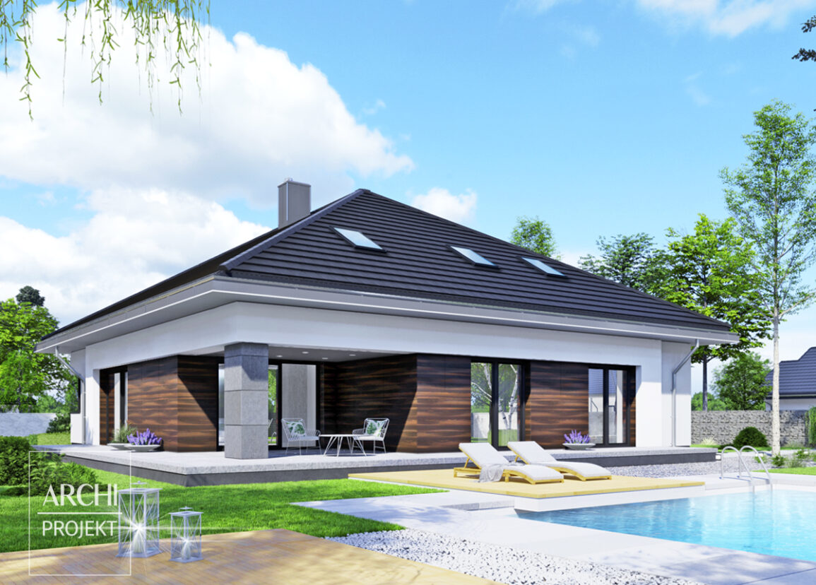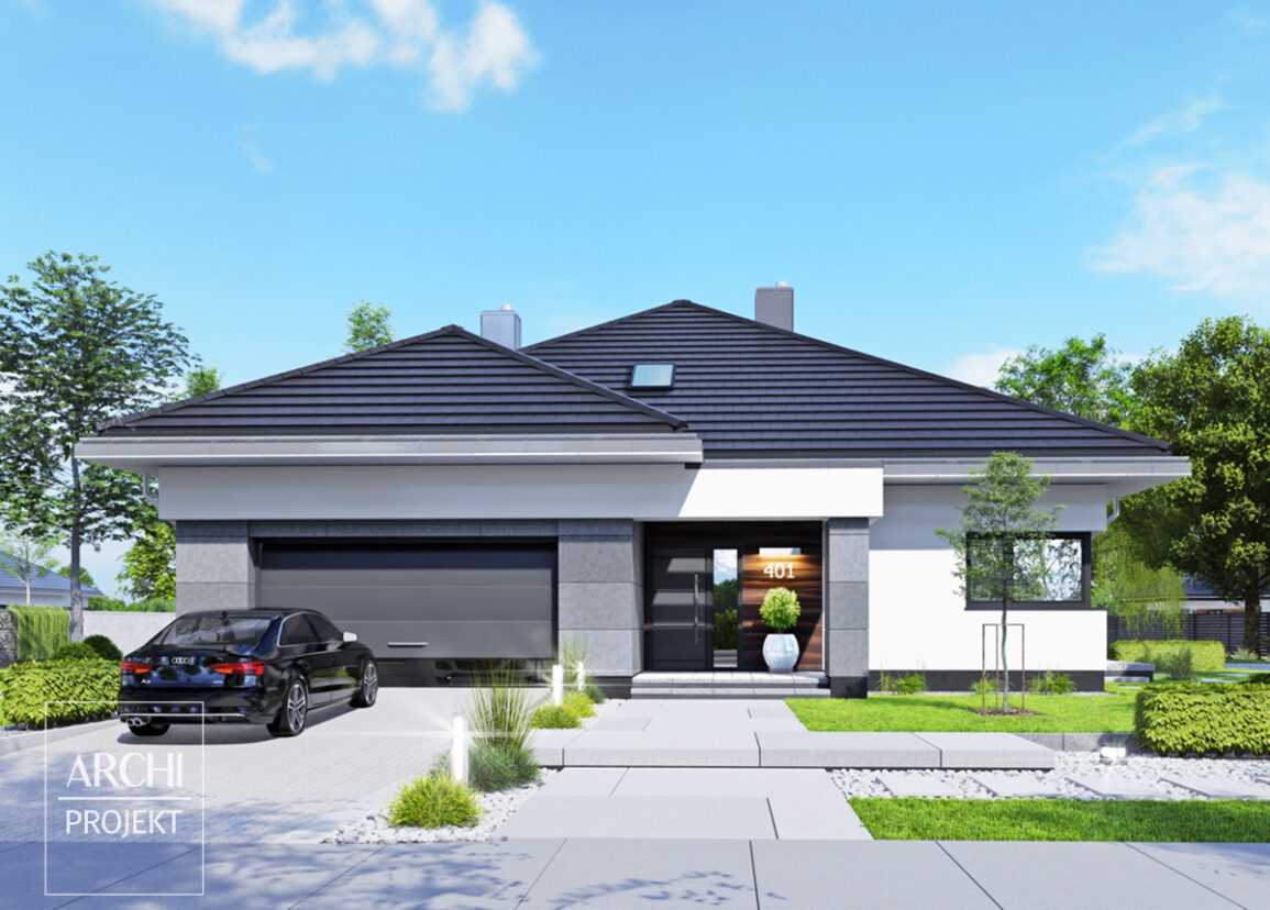 APS 401 to wygodny dom z poddaszem użytkowym o pięknej, wyróżniającej się bryle. Charakteryzuje go regularny kopertowy dach i nowoczesny podcień na elewacji frontowej. APS 401 ma wszystkie cechy praktycznego domu - w strefie wejściowej znajduje się duża szafa i przejście do garażu, przy kuchni zlokalizowano spiżarnię. W głębi domu znajduje się