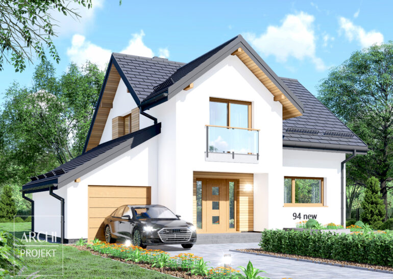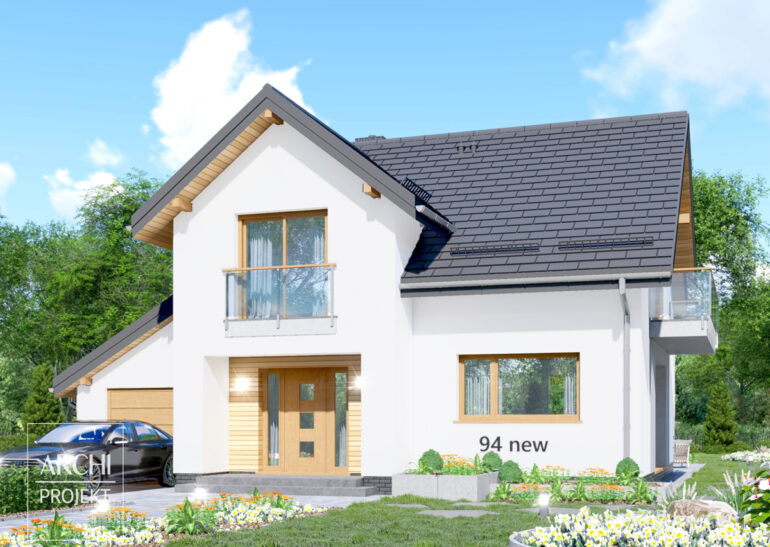 Nowoczesny, zgrabny dom dla 4-5 osobowej rodziny, z garażem dobudowanym do ściany domu. Efektowny, nadwieszony fronton domu, oparty na kolumnach, osłania wejście do przedsionka z praktyczną garderobą. Kuchnia zlokalizowana jest od frontu, dzięki temu ma widok na wejście do domu. Kuchnia ma kącik śniadaniowy i sąsiaduje z pokojem dziennym. Na styku pokoju z kuchnią - część jadalna. Z pokoju dziennego - przejście na zadaszony, duży taras, który można obudować jak oranżerię, druga część tarazu jest odsłonięta. Na parterze także: łazienka, oraz kotłownia i garaż na obniżonym poziomie. Na poddaszu znajdują się trzy sypialnie z balkonami, oraz łazienka z wejściem do niewielkiej suszarni. Zobacz także projekt - APS 68, APS 094.